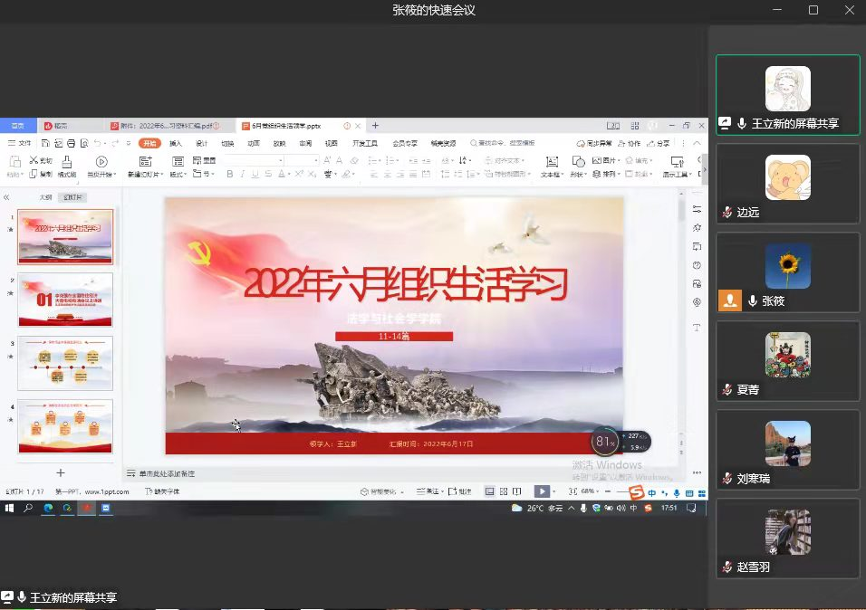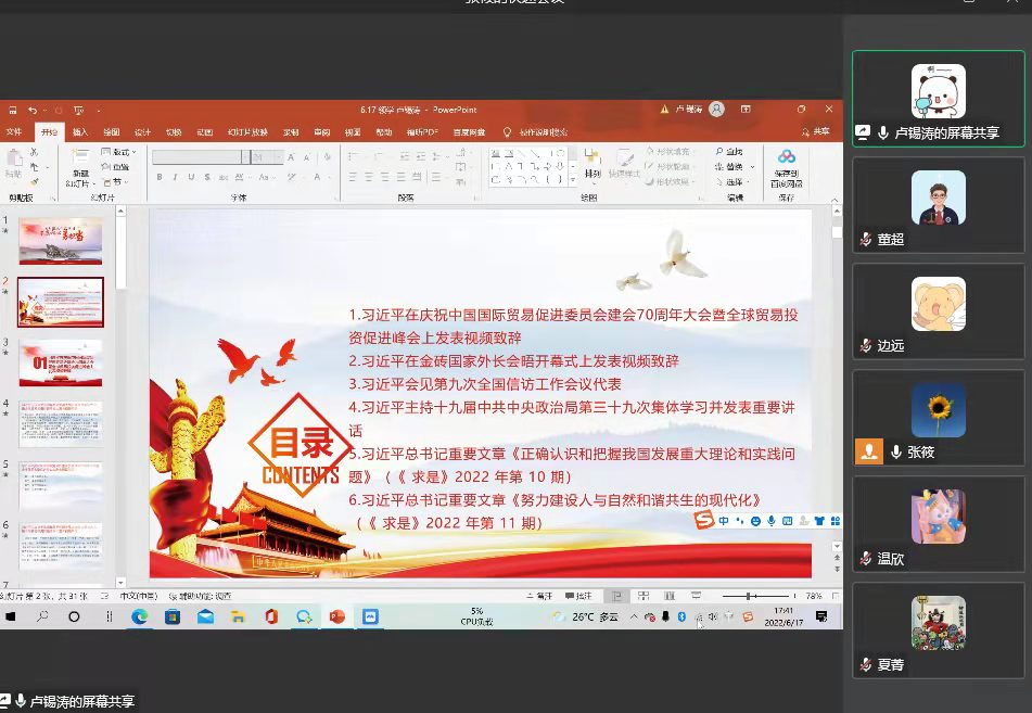 2022年6月17日17:30,太阳成集团tyc151cc研究生一支部于线上召开了六月组织生活会,本次会议由何祖润同志主持,会议的主要内容为六月组织生活会学习。