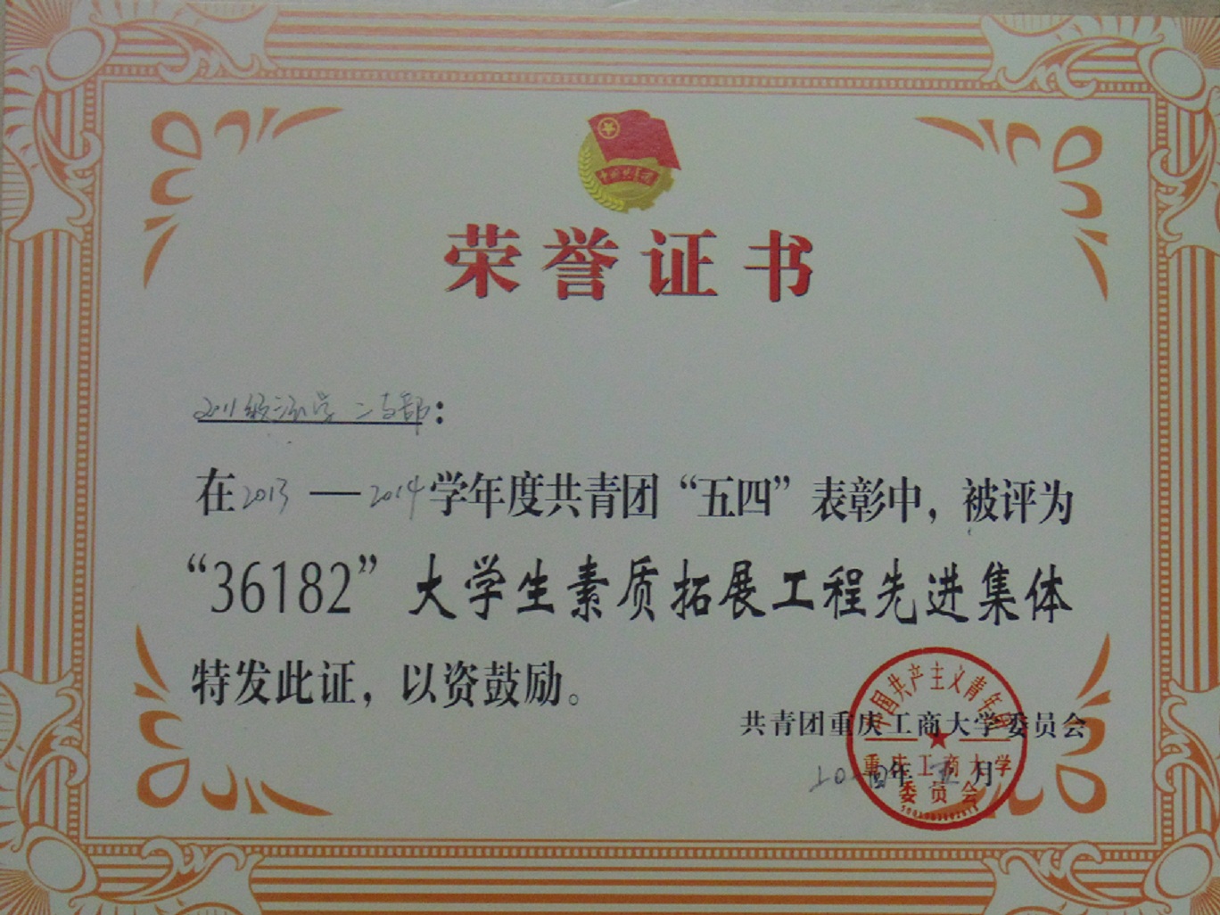 热烈祝贺公司2011级法学二支部在2013—2014学年度共青团“五四”表彰中,被评为“36182”老员工素质拓展工程先进集体。