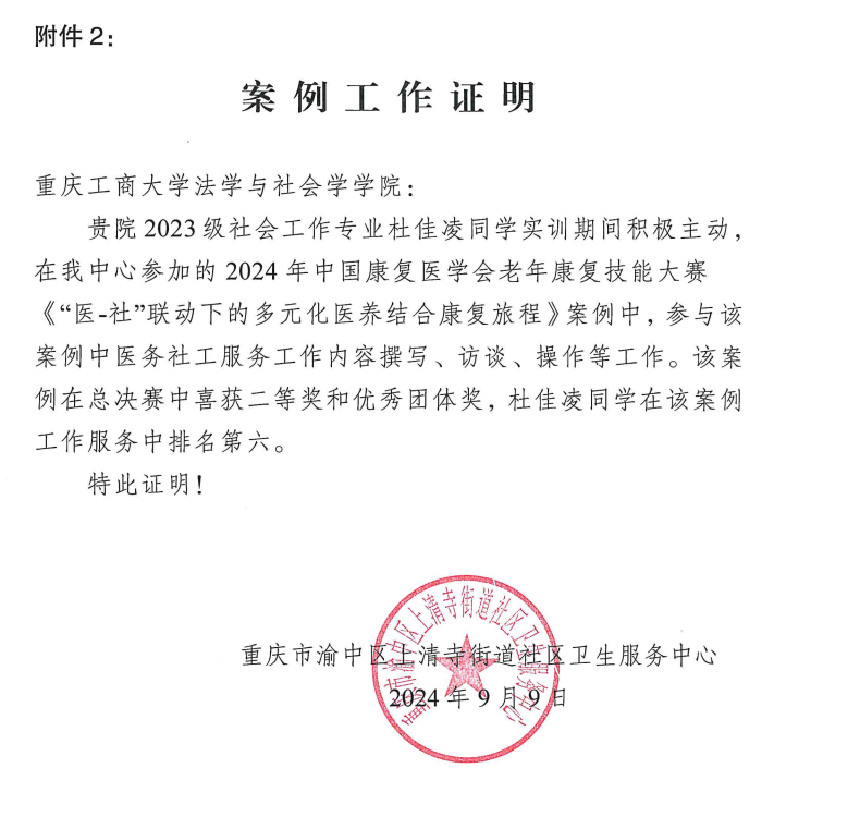 为进一步培养公司社会工作专业硕士的专业意识,提升专业能力,公司积极组织硕士研究生参加暑期实习实践。2023级社会工作专业硕士班的庄明与杜佳凌同学在重庆市渝中区上清寺街道社区卫生服务中心实习期间,积极参与2024年中国康复医学会老年康复技能大赛,助力实习单位在总决赛中荣获二等奖和优秀团体奖,获得了中心的高度赞扬与表彰。