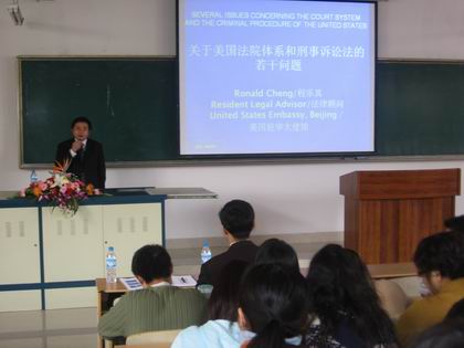 受公司外事处以及法公司的邀请,美国驻华大使馆法律顾问程乐其博士于2007年3月22日下午在博智楼7221教室给法公司师生做了一场题为“关于美国法院体系和刑事诉讼法的若干问题”的学术讲座。