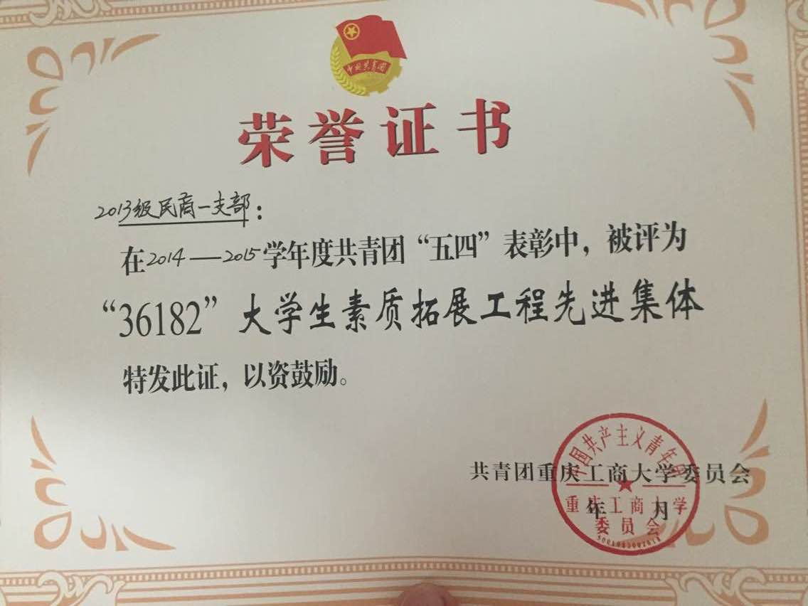公司历来重视员工的德智体美全面发展,让员工各种修养素质得到拓展是公司重点工作。经过民商法1班同学们的不懈努力,2013级民商1支部,在2014—2015学年度共青团“五四”表彰中,被评为了“36182”老员工素质拓展工程先进集体。