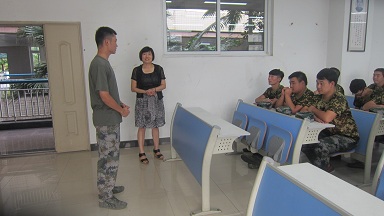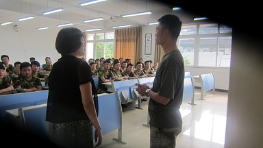 7月9日,军训的第四天下午,骄阳似火,同学们的户外训练因炎热的天气转为室内学习。法公司党总支书记李自维教授来到教室关怀同学并对全体学员做出了军训生活中的学习指导。