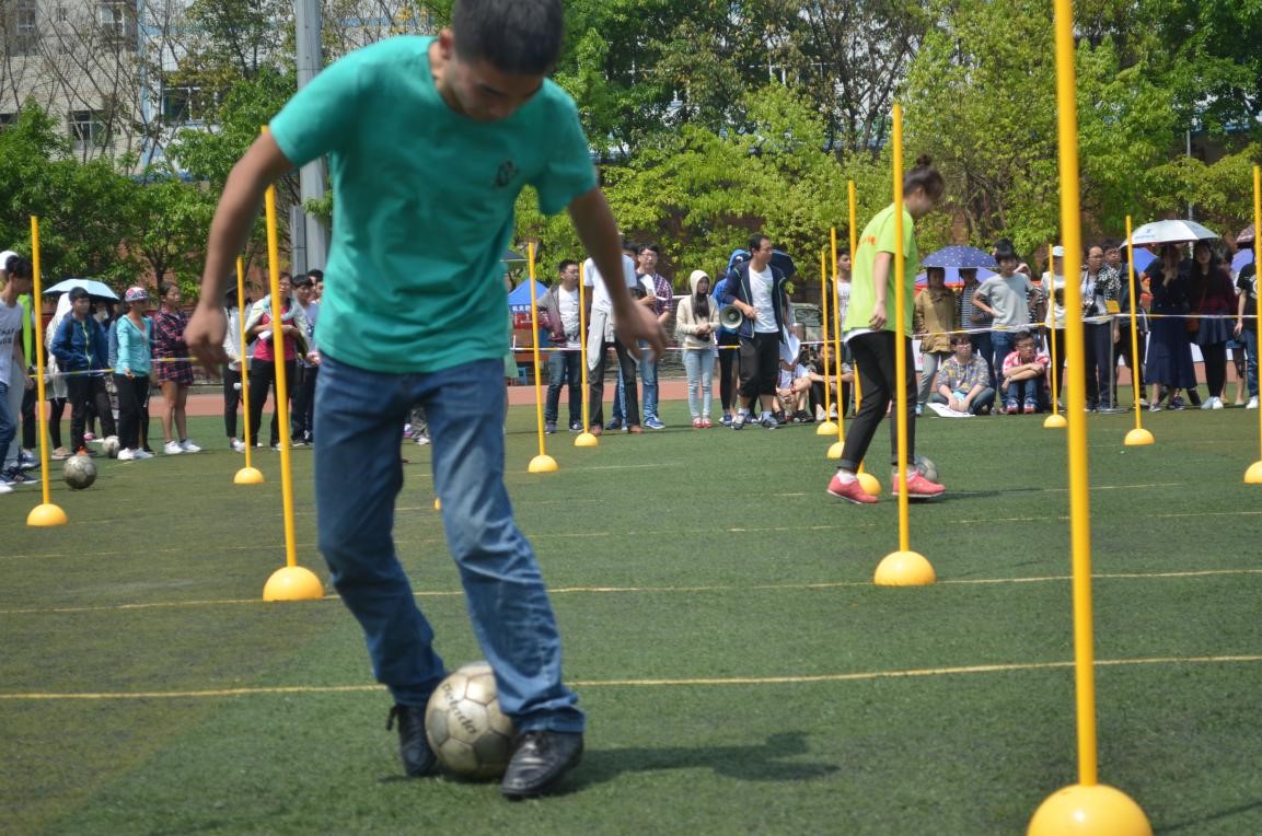 运着足球游刃有余的绕杆