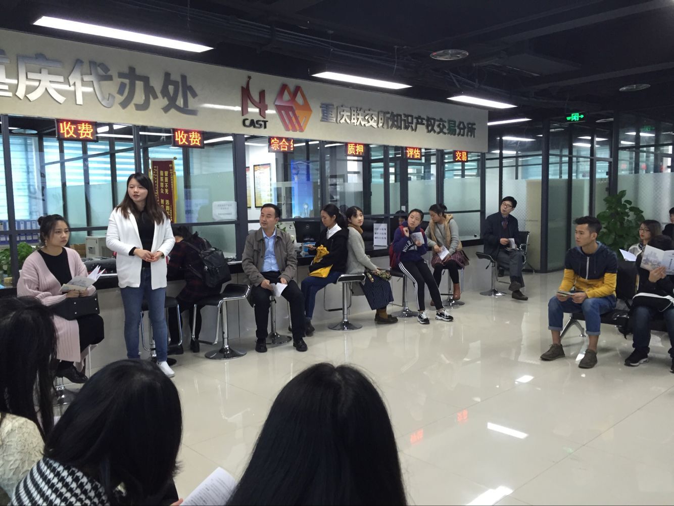 公司师生一行到达国家知识产权局专利局重庆代办处后,杨经理首先向国家知识产权局专利局重庆代办处的负责人介绍了此次参观学习的目的,并感谢该单位的接洽。重庆代办处负责人表示热烈欢迎太阳成集团tyc151cc法公司师生前来学习交流,并带领大家参观了代办处的办公大厅,向大家介绍了代办处的职能,同时在参观过程中介绍了内部大厅的格局和一些专利产品。之后,由重庆代办处的专业人员以讲座的形式为师生讲解了重庆代办处的业务流程,关于专利申请、专利电子申请、专利质押登记和国家知识产权局专利收费标准等内容。同学们认真听讲并专注地做笔记,积极地向讲解人员提出自己的疑问,讲解人员对同学们的疑问进行了耐心解答。最后,重庆代办处负责人向同学们提出了知识产权专业员工未来职业发展方向的建议,同时祝愿同学们未来能够学业有成。到此,此次参观接近尾声,整个参观过程轻松愉快,同学们获益匪浅。
