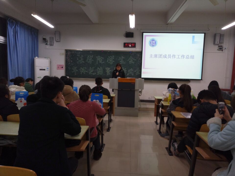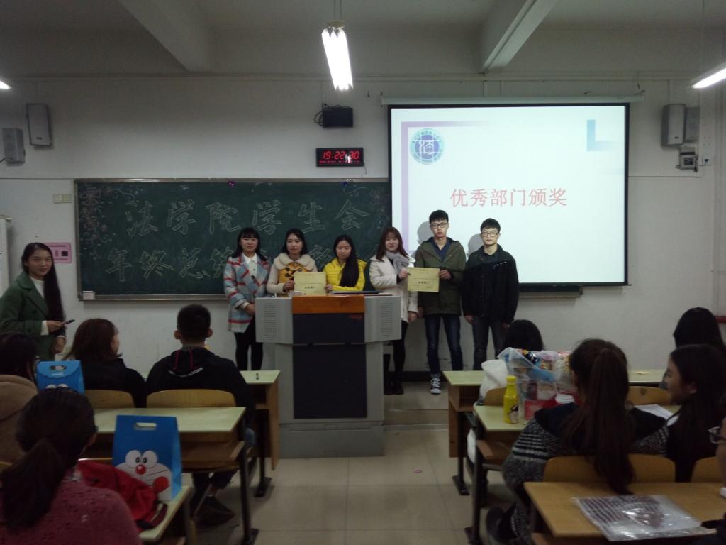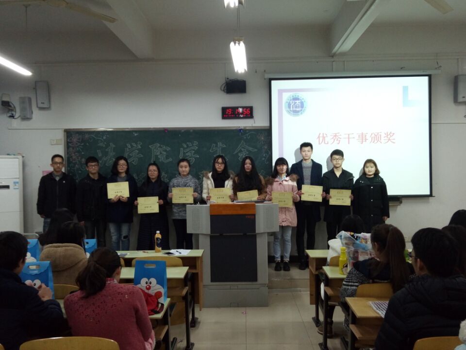 12月21日晚上7点,太阳成集团tyc151cc法公司分团委员工会在江北校区宏志楼105教室召开了年终总结暨表彰大会。此次大会的目的是对这一学期的工作进行汇报总结和对优秀干事、优秀部长、优秀部门进行表彰。参加本次大会的人员有员工会主席团、部长团以及全体干事。各部长带来了为干事们精心准备了礼物,大会现场气氛轻松欢快。员工会副主席张亚玲担任了本次大会的主持人。