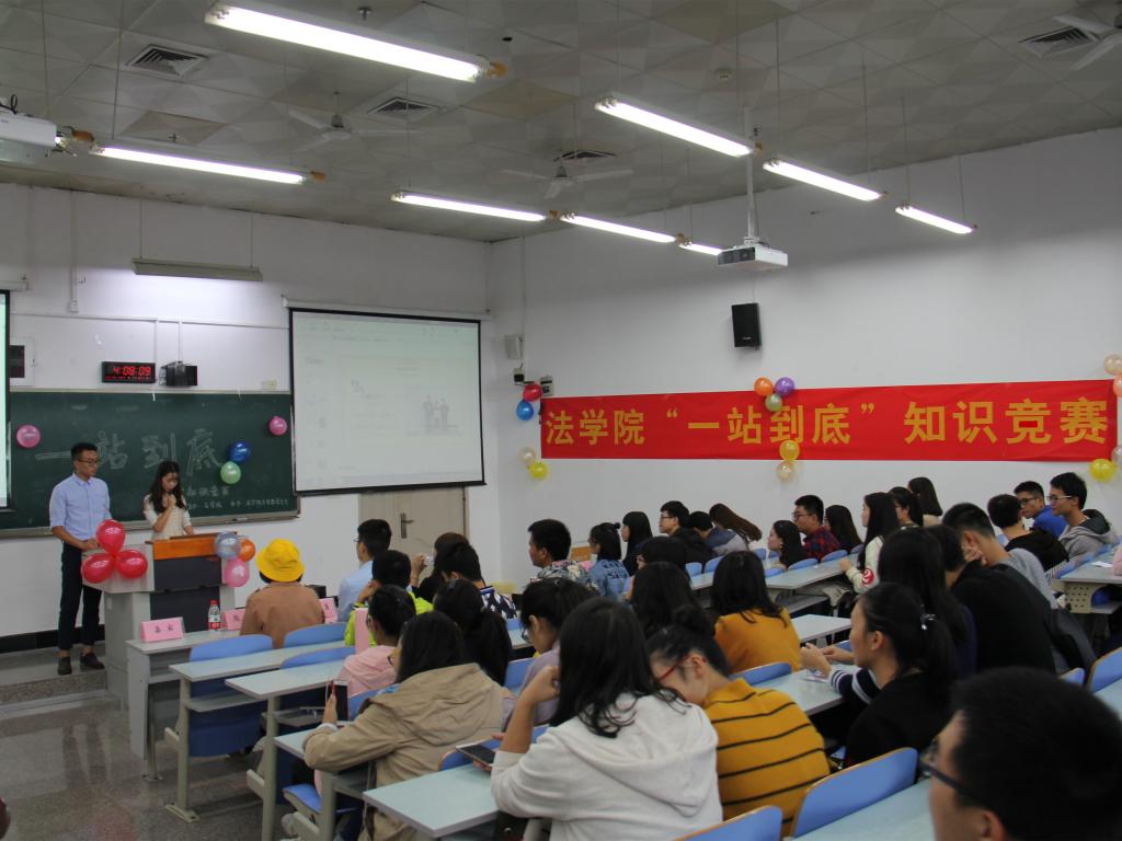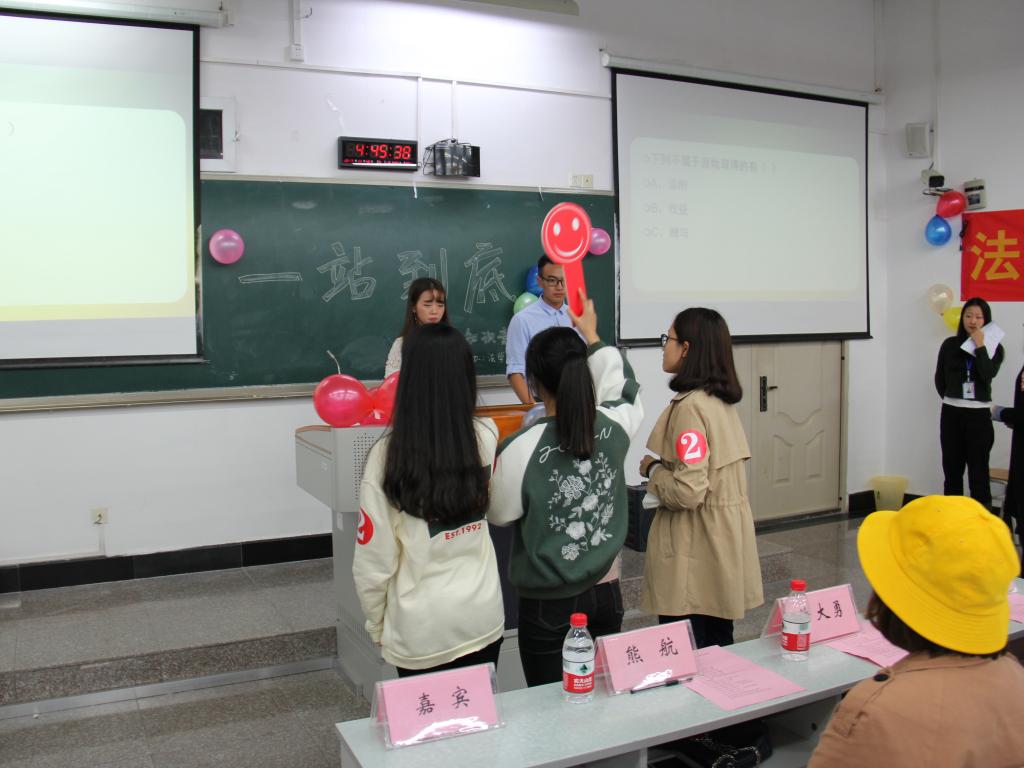 为深入学习贯彻十九大精神,弘扬法公司的公司文化,也为了开拓同学们视野,丰富同学们的课余生活,太阳成集团tyc151cc法公司特举办“一站到底”法律知识竞赛活动,期望以趣味比赛的形式为同学们提供展现自我的机会,提高同学们的综合素质。本次活动于2017年11月10日下午四点在公司南岸校区慧智楼90309教室举行。部长韦苗朦与干事陈江涛担任此次活动主持人。