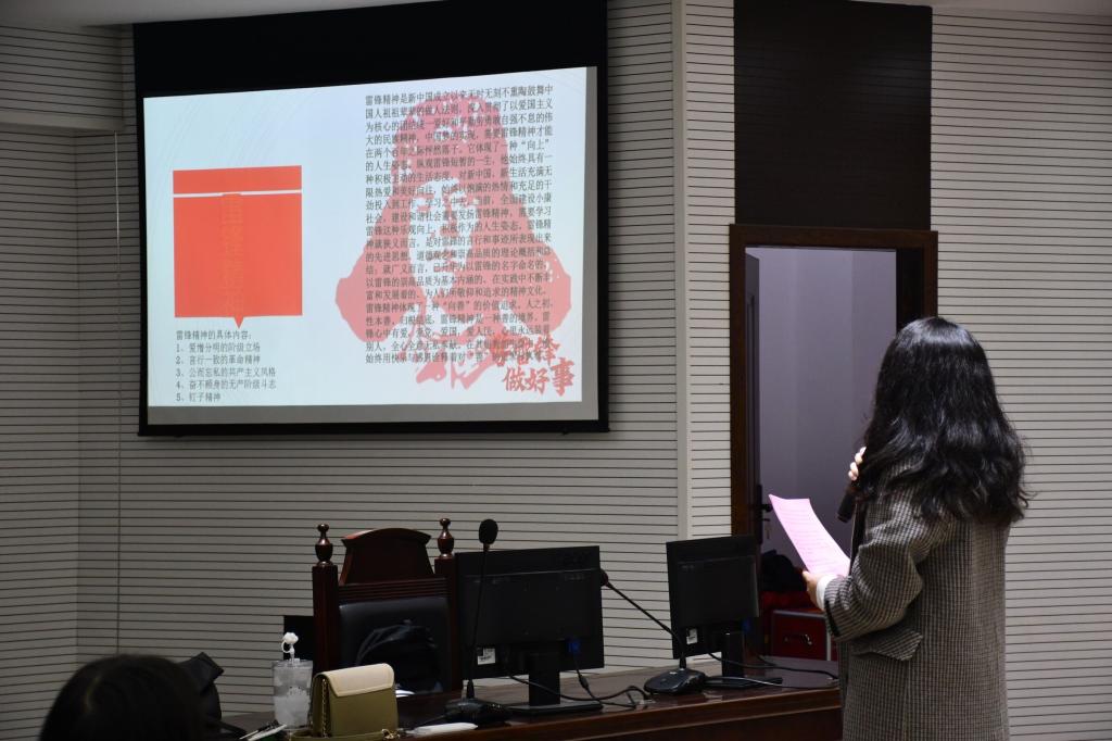 会议继续,一段关于雷锋精神的视频引起了所有人的共鸣。雷锋的日记中有:人的生命是有限的,为人民服务是无限的,我要把有限的生命投入到全心全意的为人民服务当中去。雷锋是青年的偶像,是人民的英雄,也是时代的精神。然而,当今社会雷锋精神却遭到质疑,其实并非是雷锋精神本身遭到了质疑,而是我们需要以一种适应时代的方式去继承雷锋精神。雷锋精神不应该只是一种口号,不能只是一种形式主义,应该用我们的行动去表达,就像我们可以看到:郭明义20年无偿献血、刘盛兰一生帮助贫困员工......他们都是雷锋精神的践行者,而我们也会是未来的千千万万个践行者。
