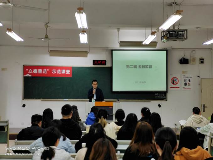 10月22日上午,法学系李响老师在慧智楼90322开展了“立德垂范”示范课堂活动,讲授了《金融法》的“金融监管”内容,李老师以历届全国金融会议为例,通俗易懂地讲解了金融监管的概念、分析了金融监管法的意义以及金融监管法的目标。