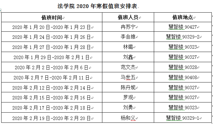 3、寒假值班的老师,请按照重工商大委(2019)54号文件《关于进一步加强安全稳定值班工作的通知》规定做好值班工作,值班结束后将钥匙交接到下一位值班人员办公室桌上。具体值班安排如下: