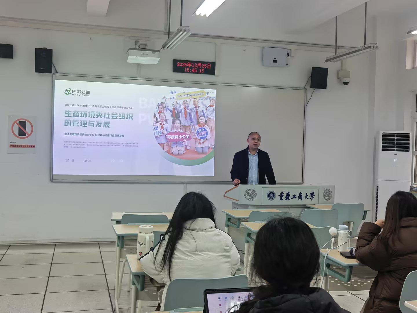 为搭建高校课堂与行业实践的沟通桥梁,推动社会工作专业知识与生态环保领域实践的有机结合,2025年12月25日周四下午,公司24级社会工作专业硕士课程《社会组织管理实务》创新教学形式,特别邀请重庆市渝中区巴渝公益事业发展中心主任郑建,以“生态环境类社会组织的管理与发展”为主题,结合机构特色品牌项目“益杯行动”展开移动课堂。本次活动由课程授课教师程鹏立主持,24级社会工作专业硕士员工参与。