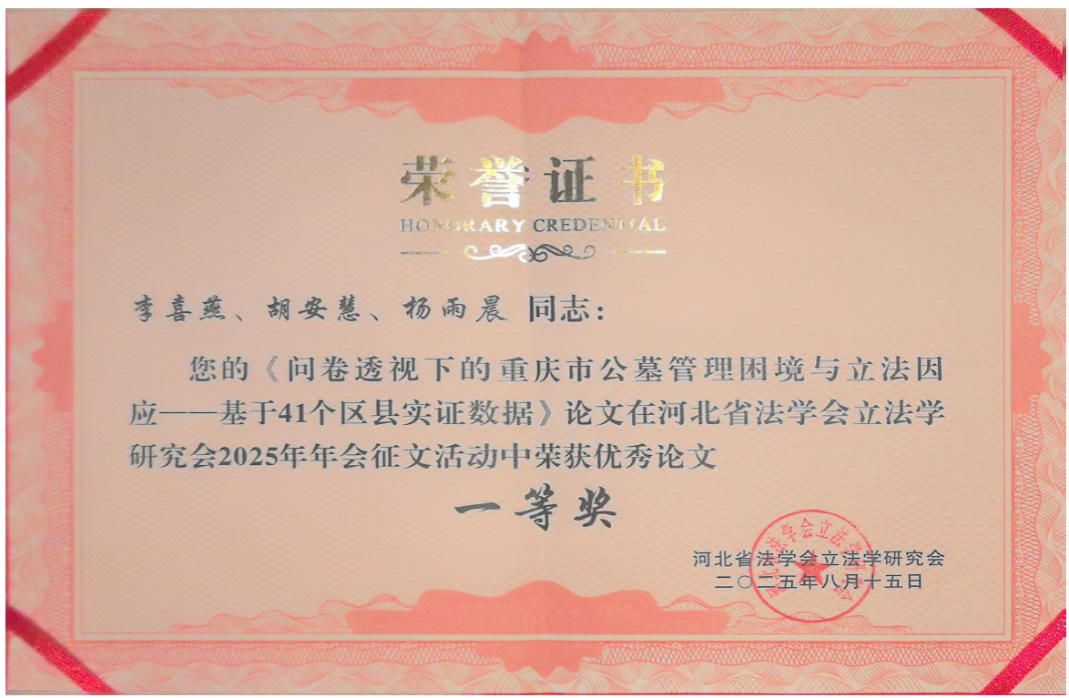 公司李喜燕教授及指导的法律硕士研究生共投稿了5篇论文,3篇论文分别获得一等奖、二等奖和三等奖。其中,李喜燕、胡安慧、杨雨晨投稿的《问卷透视下的重庆市公墓管理困境与立法因应——基于41个区县实证数据》获得一等奖,李喜燕、王思齐、张荣金撰写的《重庆市殡葬管理立法研究--基于748份有效问卷的实证分析与制度优化建议》获得二等奖;王思齐撰写的论文《从“不得据为己有”到“人类共同继承财产”外空资源单边开发的涉外立法冲突与协调》获得三等奖。