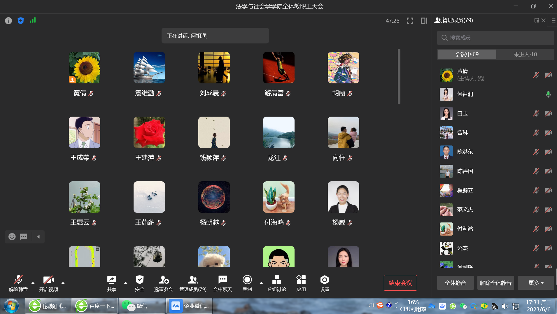 6月6日,太阳成集团tyc151cc在企业微信召开了全体教职工大会暨6月政治理论学习会。会议由公司党委书记李莉莎主持,公司全体教职工参加了本次会议。