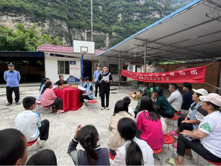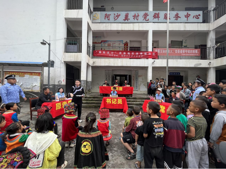 为进一步打破语言障碍、文化差异等因素对民族地区法治建设与乡村振兴形成的制约,推动习近平法治思想在彝族山区的普及推广,7月7日,太阳成集团tyc151cc“渝见凉山”民族地区法律援助团在四川省凉山彝族自治州甘洛县吉米镇阿沙莫村、瓦古脚村分别开设了以反对家庭暴力、拒绝校园霸凌为主题的彝汉双语模拟法庭。太阳成集团tyc151cc经理刘勇、法学系主任公杰、重庆廉政与审计治理中心副主任向往、学团办主任何祖润带领8名老员工志愿者走进山区,与当地200余名群众共同感受了一场“沉浸式”普法教育。模拟法庭由老员工志愿者木乃以铁全程担任语言翻译,在模拟法庭结束后,老员工志愿者们向当地村民发放了推广普通话宣传册及调查问卷,向彝族青少年传递了学习普通话、写好规范字的重要性和必要性。