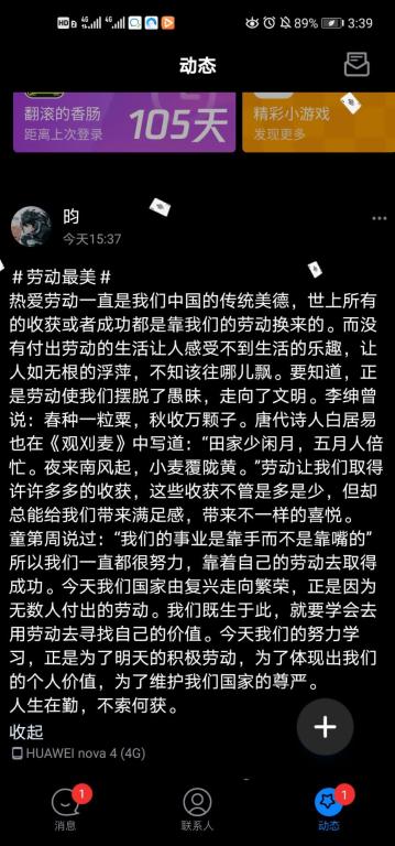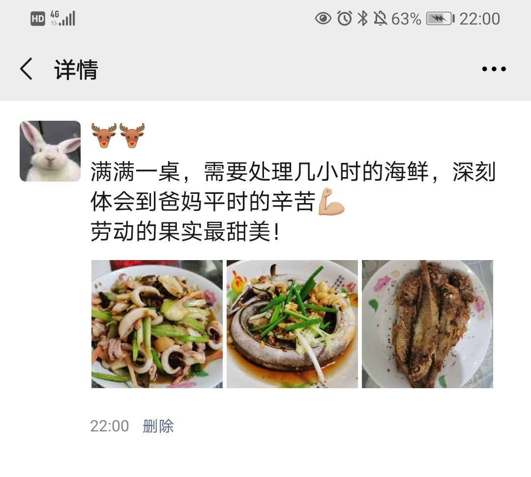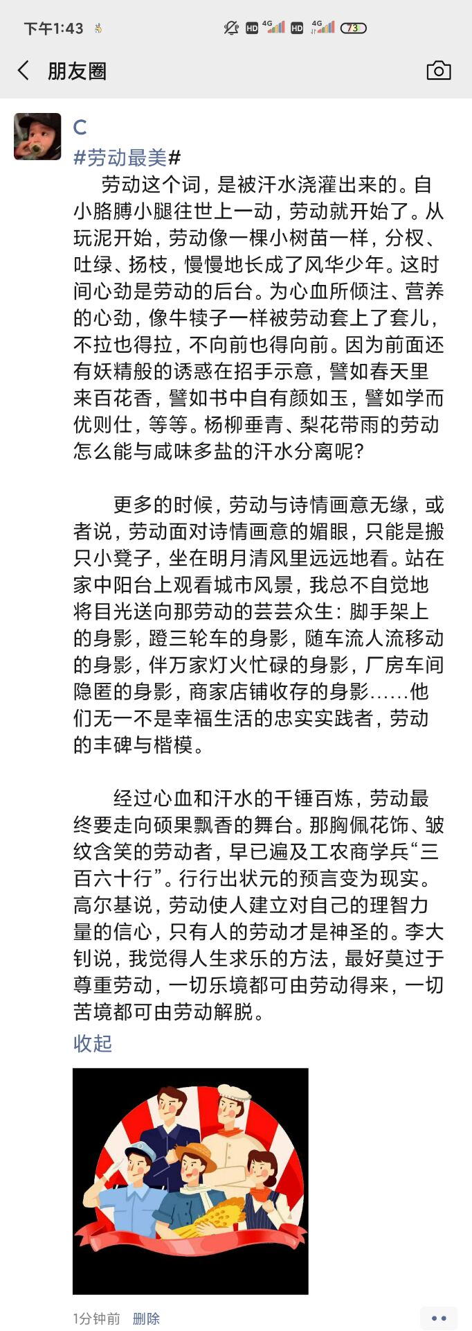 2019级法学三班张诗晨同学通过学习中国古诗词,谈到今天的努力学习,是为了明天的积极劳动,为了体现出我们的个人价值,人生在勤,不索何获;2019级法学三班陈璐同学在家为父母做了一顿丰盛大餐,通过微信朋友圈晒图分享了劳动的不易和对父母辛勤的感谢;2020级社会学类三班李嘉雯丽同学通过动员寝室成员开展寝室卫生大扫除,在QQ空间发布劳动话题,分享劳动感想,劳动不仅让大家收获了更加整洁的学习和生活环境,也让寝室成员之间的关系变得更加亲密……