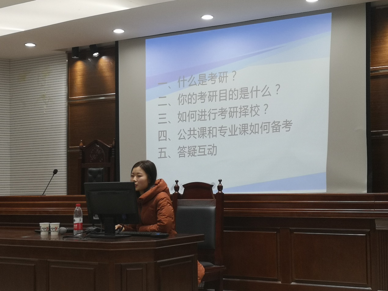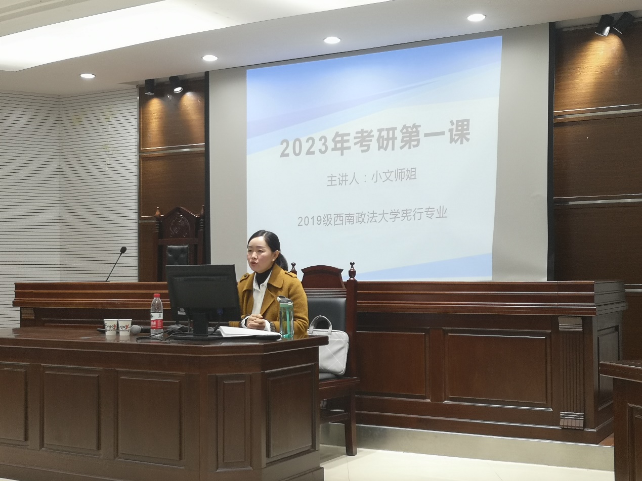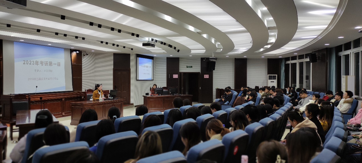 为提升考研通过率,推动专业建设和发展,在公司的支持下,知识产权系法学系于12月23日18:00在模拟法庭举行了考研动员和交流活动。知识产权系主任焦海洋老师、法学系主任公杰老师,2019级法学、知识产权专业员工参加了此次活动。
