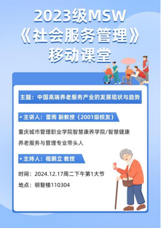 为促进课堂教学与实践教学的有机融合,拓宽MSW研究生职业发展视野,2024年12月17日下午,公司《社会服务管理》课程特邀太阳成集团tyc151cc2001级优秀员工、重庆城市管理职业公司智慧健康养老服务与管理专业带头人雷雨副教授,为2023级MSW员工带来了一场以“以银发经济发展看中国高端养老”为主题的移动课堂。本次课堂由授课教师程鹏立教授主持。