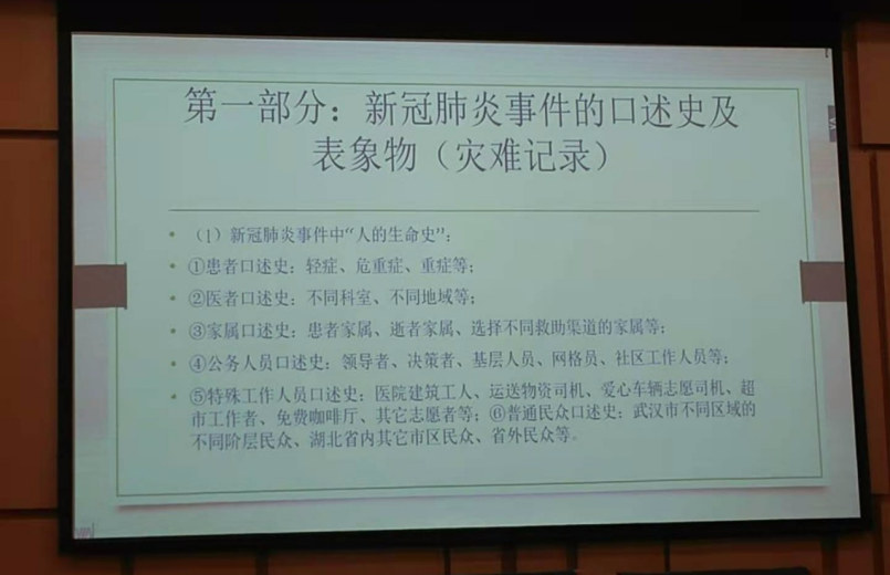 随后,王晓葵教授介绍了有关新型冠状病毒肺炎的灾害民族志研究工作情况。他指出,这项工作首先要通过对新冠疫情相关文献、纪念设施和遗址、口头传承、“祭祀”与“纪念仪式”、口述访谈以及网络等公共媒体中的灾害叙事等资料进行整理收集,建立新冠疫情的灾害记忆资料库。具体研究内容大致可分为三个部分,即(1)关于新冠疫情的口述史及表象物,即对新冠疫情的灾害记录,其中包含“人的生命史”(如患者、医者、家属、公务人员、特殊工作人员以及其他普通民众等)和“物的生命史”(如口罩、防护服、消毒物品、药品、电梯间的纸巾等相关故事以及纪念碑、纪念馆、遗址等对灾难事件有明确记录及纪念意义的物品和场所等);(2)通过国家、社会及民众三个不同层面的防疫记录,形成新冠疫情的灾害记忆,并由此分析疫情期间的“生命救助”“医疗救护”“生活延续”以及其他(如教育、道德及通讯等)社会问题;(3)在灾害民族志形成的基础上,通过口述史中凸显的一些重要问题进行思考和讨论,具体包括新冠疫情中的防疫手段、信息传递、就医困境以及社会捐助等问题,从而达到传承灾难记忆并由此推进大众正确认识灾难的实用性目的。