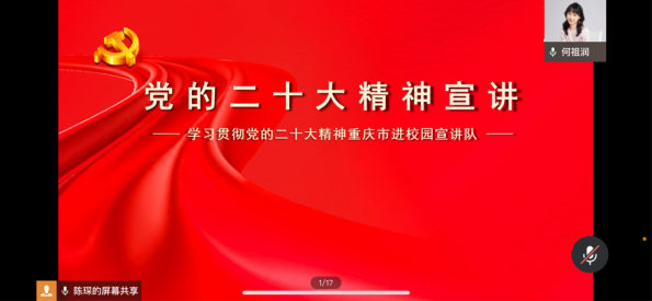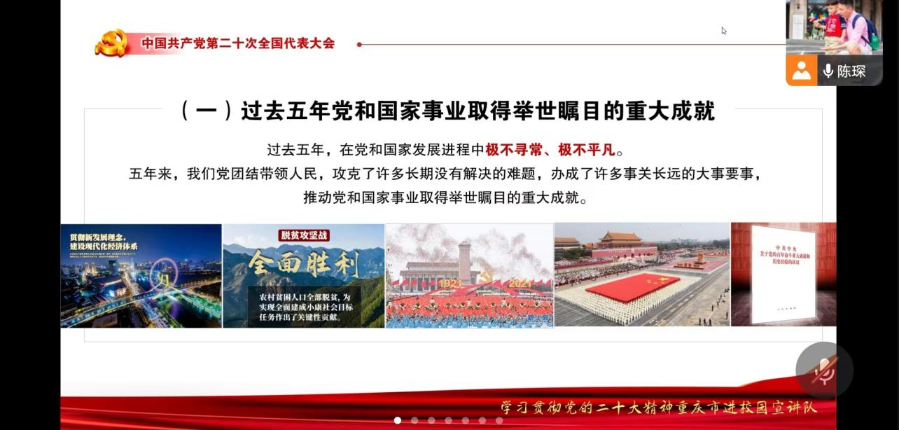 陈琛以党的二十大报告中对于过去五年的工作成果总结切入,结合新时代的伟大变革、全面建设社会主义现代化国家的目标任务、应对风险挑战等几个方面系统宣讲了党的二十大精神,带领同学们认真学习领会了党的二十大报告。
