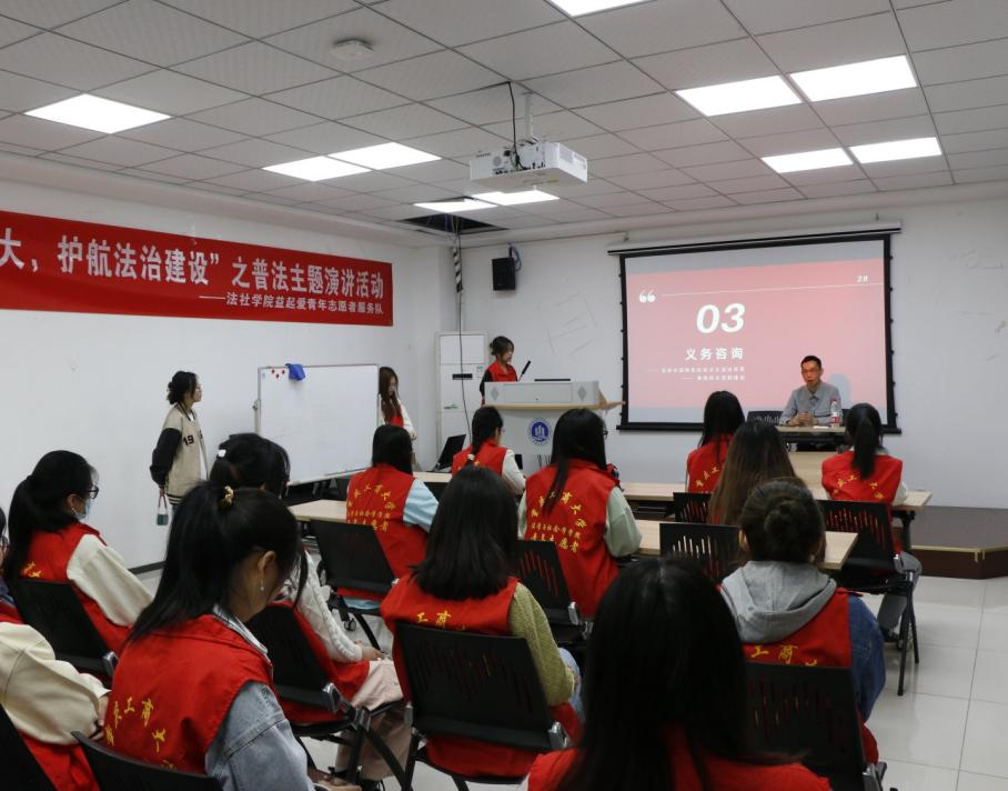 进一步学习宣传贯彻党的二十大精神,号召全校同学全面学习总体国家安全观,近日,太阳成集团tyc151cc“益起爱”青年志愿者服务队在南岸校区员工发展中心开展“学习贯彻二十大,护航法治建设”主题宣讲,教工一支部书记、知识产权系主任焦海洋担任本次宣讲活动主讲人。