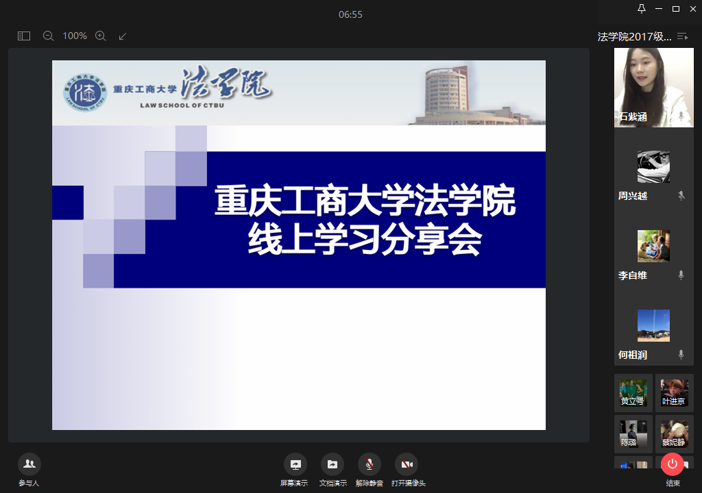 4月10日下午3点,2017、2018级员工通过企业微信开展了长达三个小时的线上学习分享会,公司班子成员、系主任、实践教学主任、院级教学督导、公司教师和辅导员30余人参加了会议。分享会上,同学们就近期在线学习情况做了分享,2017级法学一班杨嘉豪谈到,线上学习能与教师保持良好的互动交流,通过课程群平台相互提醒,相互督促,共同进步。同学们畅所欲言,2018级法学一班罗宇露结合近期学习实践,分享了参加学科竞赛的心得体会和经验总结,鼓励同学们学会合理运用知网等平台查阅期刊资料,用活动赛事经历充实自己课堂外的知识积累。2017级亢若男、黄立号两位同学为大家分享了自己居家备战法考和考研过程中摸索出的一些宝贵经验,提醒同学们在复习过程中要有定力,重行动,不拖延,合理的分配利用时间,同时要注重体育锻炼,好的身体才是革命的本钱。2018级法学二班团支书李顺波就近期班级的班风、学风作了总结,分享了防疫工作中班级内部采取的宣传和举措,为同学们居家学习加油鼓劲。