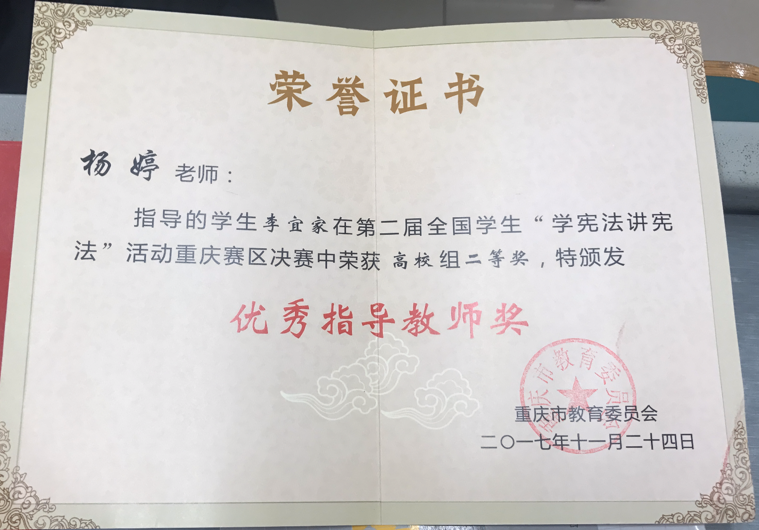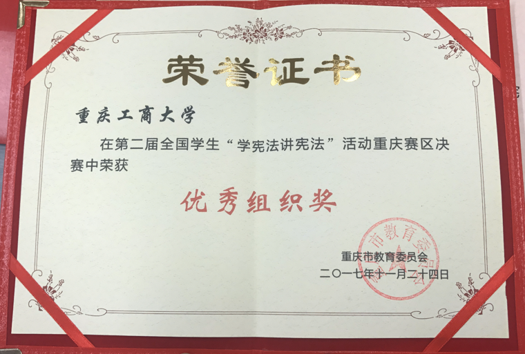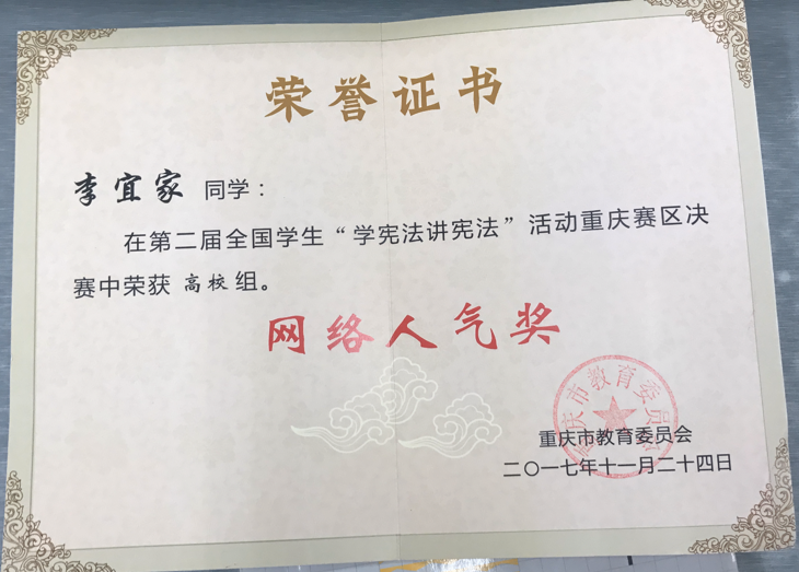 重庆市“学宪法,讲宪法”由重庆市教委主办,参赛选手来自重庆市五十余所高校,通过海选,复赛,决赛的方式遴选,今年作为该活动举办的第二年,在创新原有活动形式的基础上依旧保留了演讲比赛这一富有感染力的宣传形式。公司2015级李宜家同学在该比赛中获得重庆市二等奖、网络人气奖,指导教师杨婷获得优秀指导教师奖,还代表公司获得优秀组织奖。