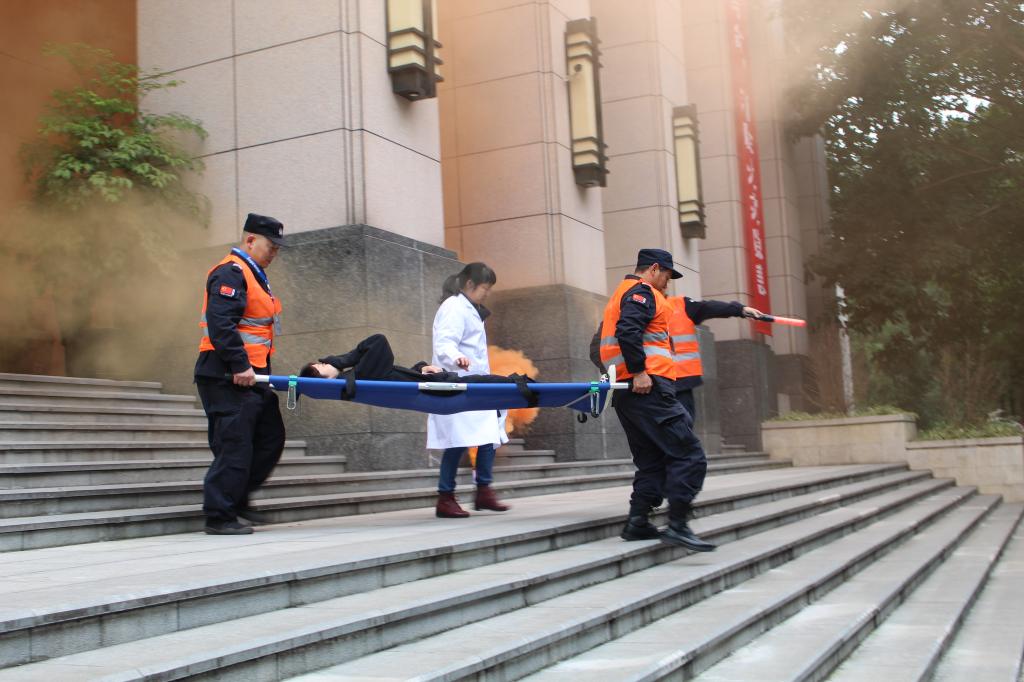 本次应急疏散演练的内容为应急报警、应急疏散、灭火救援、反恐处突以及灭火操作。为确保此次消防演练活动顺利实施,公司制订了切实可行的活动方案,精心策划、周密部署。随着图书馆三楼外侧烟雾弹的燃起,应急疏散演练正式开始。在发现火情的第一时间,图书馆消防控制室值班人员立即向保卫处报警。保卫处指挥员下令切断大楼内部电源,打开疏散通道,立即向119报警反映情况请求支援,并即时启动应急预案,紧急疏散人员,准备实施灭火。馆内师生用手捂住口鼻,在保卫处人员有序引导和指挥下迅速撤离,灭火人员和反恐人员随即进入大楼实施灭火和搜救,火情很快得以控制。此时,指挥员再次接到报警,称楼内有一名员工受伤严重,请求担架支援。两名消防队员和一名医生当即进入现场,将受伤员工用担架抬出,紧急送往医院救治。随着人员撤离完毕,火势得到控制,此次反恐灭火应急疏散演练顺利结束。各组报告火险原由及人员疏散情况,随即进行最后一项演练内容:灭火操作。在消防队员的指导教学下,现场师生都实际体验了灭火器的操作方法。