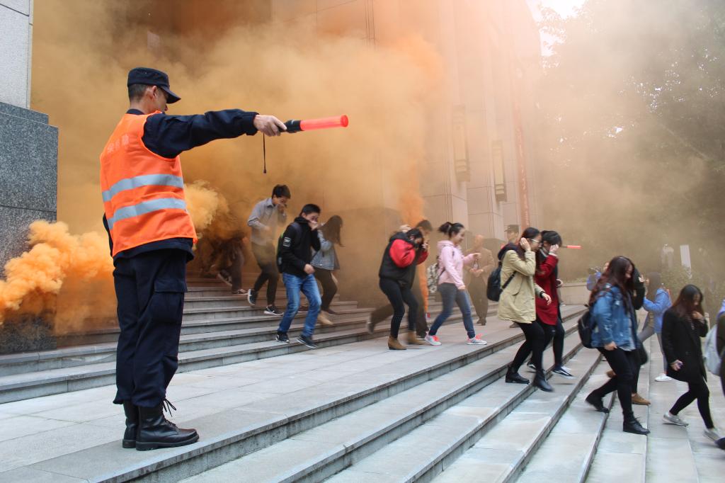 为进一步加强消防安全宣传教育,普及反恐防震灭火知识,增强师生员工的安全防范意识,提高自防自救能力,11月9日下午,公司反恐灭火应急疏散演练在南岸校区图书馆南楼举行。法公司副经理刘勇、副书记林璐、分团委书记罗观以及公司16级、17级两百余名员工参加本次演练。