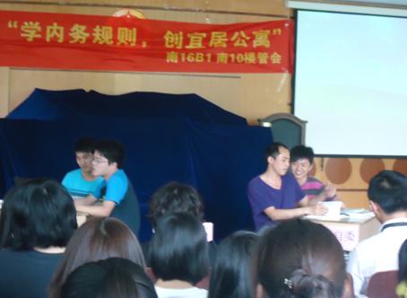 活动首先由黄河老师致辞,并介绍此次活动的背景、目的以及活动基本情况。接着,同学们表演了别开生面的小品《乱“室”家人》,小品让同学们深有感触,踊跃地发表了各自感想,并对如何搞好内务卫生提出建设性意见。接着,优秀寝室的图文展示,使同学们对于优秀的内务卫生有一个直观的认识,优秀寝室成员也随之畅谈对宿舍文化的认识、保持宿舍卫生优秀的窍门、对男生寝室如何保持良好卫生的建议等卫生方面的心得。通过回答小问题的环节,考察了同学们对员工处下发的关于卫生奖励与处罚相关条例的了解程度,同时也借此对同学们进行一次宿舍管理条例的再教育,增强了同学们对寝室卫生的重视。