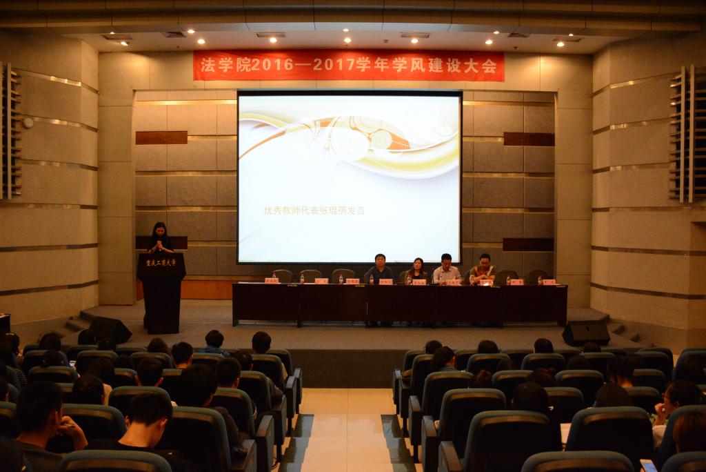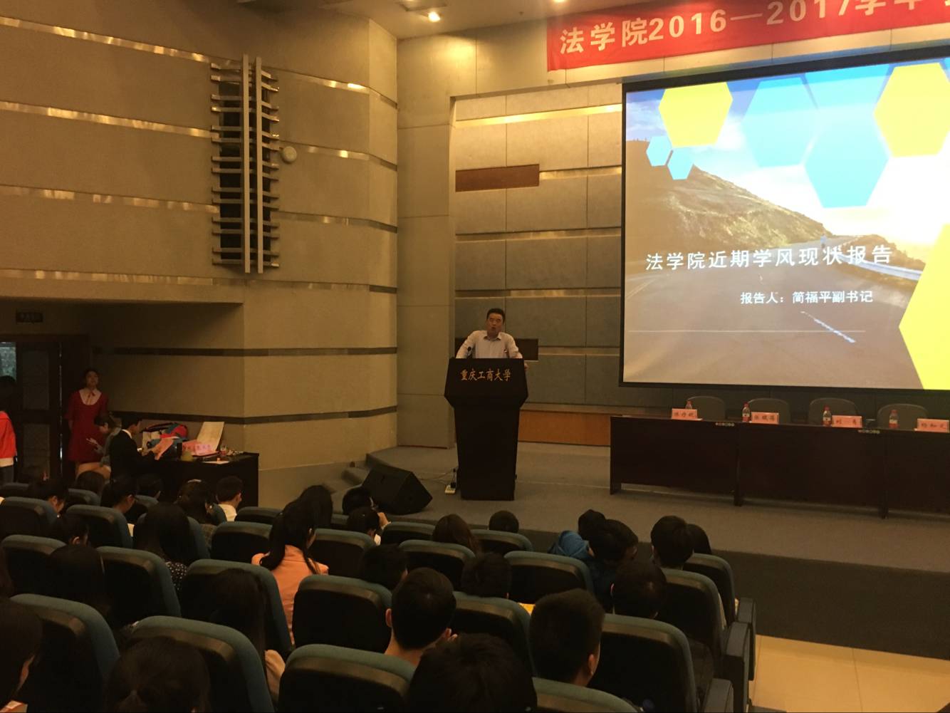 5月24日18:00,法公司2016-2017学年学风建设大会在博智楼7100学术报告厅隆重举行。出席本次活动的领导及嘉宾有:法公司党总支部书记硕士生导师李自维教授、法公司经理硕士生导师杨和义教授、法公司党总支部副书记硕士生导师简福平副教授、法公司副经理硕士生导师刘勇教授、广东外语外贸大学法公司副经理王荣珍、西南大学心理学博士邓敏、优秀教师代表张琨蓓博士、党政办范志军主任、学团办全体辅导员以及法公司大一至大三年级400余名同学参加了此次大会。