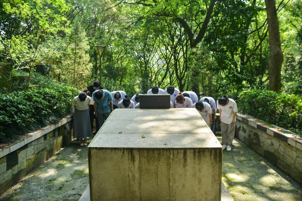 图为教工样板支部党员带领理论宣讲团成员在烈士墓前鞠躬敬礼。