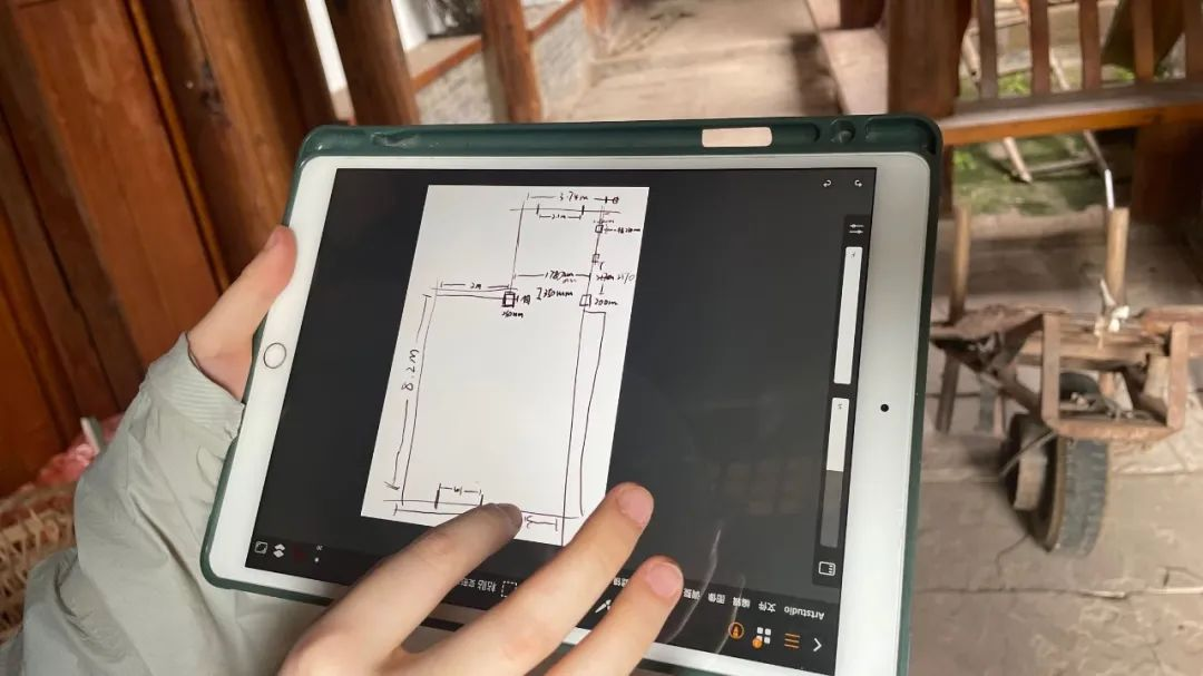 7月15日,调研团成员前往二佛村下涞滩考察陈列馆选址。在这个始建于宋朝并入选“中国传统村落”的千年古镇,成员经过多方比较和咨询,最终选择位于下涞滩正街且靠近渠江(涞水)畔的旧宅作为乡情馆的主要设计空间。在孟令法的指导下,调研团成员对该空间进行了详细的测量和记录,包括房屋的面积、结构、布局、材料等,并结合涞滩独特的文化底蕴将陈列馆分为四个展区:历史展区、民俗展区、艺术展区和人物展区。最后成员们现场绘制了一份乡情馆的设计草图和测量图。经过讨论,设计团队将陈列馆命名为“涞滩印象”,希望通过这个名片传达出涞滩古镇的人文风情和历史积淀。与此同时,调研团成员借助入户访问村民的契机,进行展品实物资料的预先普查工作,记录得到20余条展品线索,包括传统农具、老照片、老物件、古钱币、老家具等。