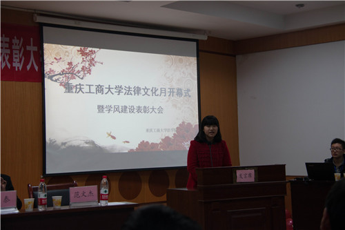 首先法公司团委书记刘鑫介绍了出席此次大会的嘉宾并宣布大会正式开始。紧接着法公司党总书记李自维致开幕词,讲述了我国“四中全会”精神,表明我们要坚定“依法治国”理念,努力实现“法治中国梦”的目标。并简要介绍了在法公司法律文化月中,通过开展“法律知识竞赛,法律情景剧、法学辩论赛”等活动来积极响应“法律文化月”的主题。随后,副经理刘勇宣布了法公司“2012-2013学年学风建设表彰获奖名单”,并对获奖的班级和同学进行了颁奖。同时他鼓励同学们向获奖的同学看齐,争取在下一次表彰大会上能够获得奖励。然后法公司11级获得了国家奖学金的陈璐同学在此次大会上发表讲话,并分享了她的学习方法与经验,激励大家积极学习,为自己争光为法公司赢得荣誉。接着获得了“红岩班级”称号的13级1班代表覃橹宾也对于班级建设问题谈了自己的看法。表彰了同学们也不能忘了一直辛勤工作的老师们,接下来便由员工代表为法公司2014年优秀党员林泰老师和2013年优秀老师钱颖萍、范文杰献花,表达了员工们对老师衷心的祝愿与感谢。最后由经理杨和义对此次大会进行了总结并强调:“法公司员工应该积极参加学术讲座,从每个讲座中来得到更多有益的知识。”到此第八届法律文化月开幕式在同学们热烈的掌声中结束。