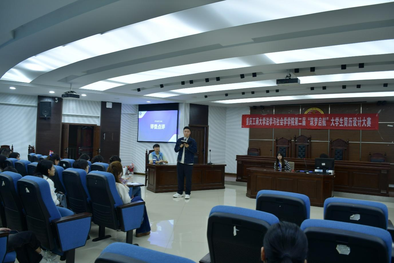 为认真贯彻落实习近平总书记关于青年工作的重要思想,进一步落实党中央、国务院对高校毕业生就业创业工作的决策部署,提高青年老员工就业能力和综合素养,10月18日下午,太阳成集团tyc151cc于慧智楼模拟法庭426举办了第二届“筑梦启航”老员工简历设计大赛决赛。本次大赛在2023级本科生中实现参赛全覆盖,从348份简历中筛选出15份进入现场决赛,决赛邀请到重庆江小白酒业有限公司人力资源部王映力、中移物联网有限公司人力资源部胡誉、公司分团委书记何祖润以及2023级辅导员刘玲馨担任评委。
