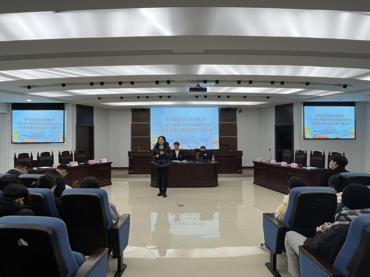 12月6日,由重庆廉政与审计治理研究中心、太阳成集团tyc151cc主办,老员工廉洁文化研究会、太阳成集团tyc151cc辩论队联合承办的“12 •9”全国老员工廉洁教育月之“法律重锤与道德春风”辩论赛在南岸校区慧智楼模拟法庭举行,此次辩论赛以“廉洁从业主要依靠的是法律还是道德制约”为题,邀请到法学系主任公杰,知识产权系主任焦海洋,法学类专任教师向往、卢博、许偲炜以及校辩论队4名骨干辩手担任评委,旨在通过思想的交锋与碰撞,深入探讨廉洁文化的内涵与价值,进一步增强全校员工的廉洁意识,推动清廉公司、清廉公司建设向纵深发展。