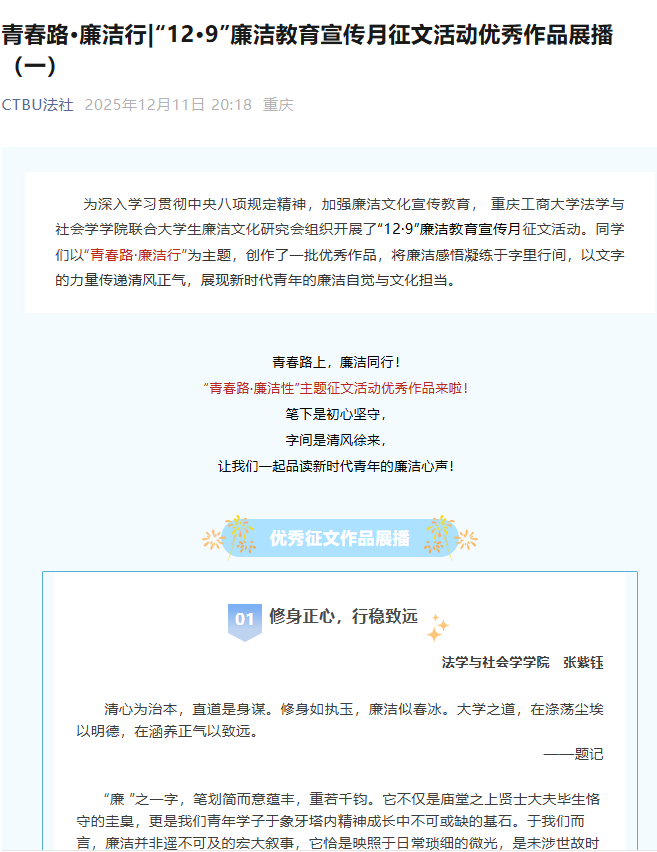 “青春路・廉洁行”廉洁文化征文比赛