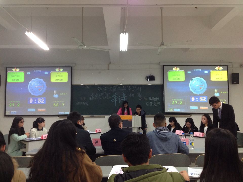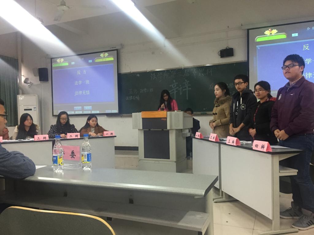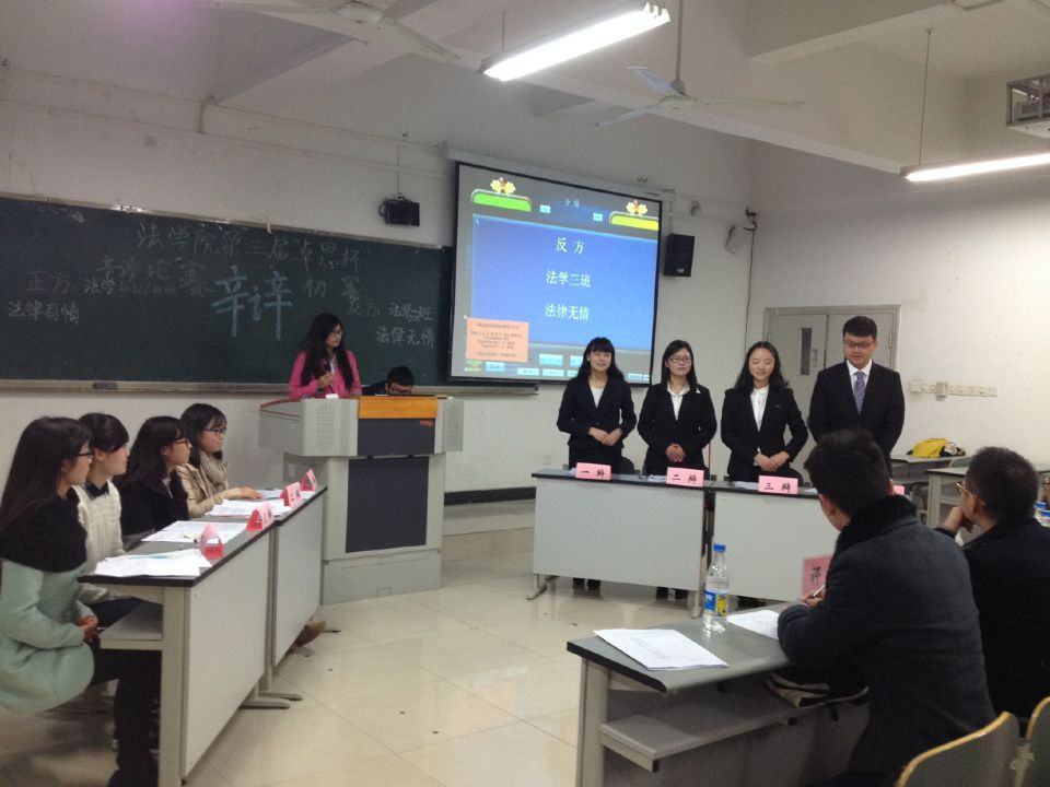 20151216   法公司就“法律有情还是法律无情”开展了辩论赛,参赛班级有:法学一班、法学二班、法学三班以及知识产权班。这四个班级将于下午的5点至7点在兰花湖20307教室展开激烈的角逐赛。