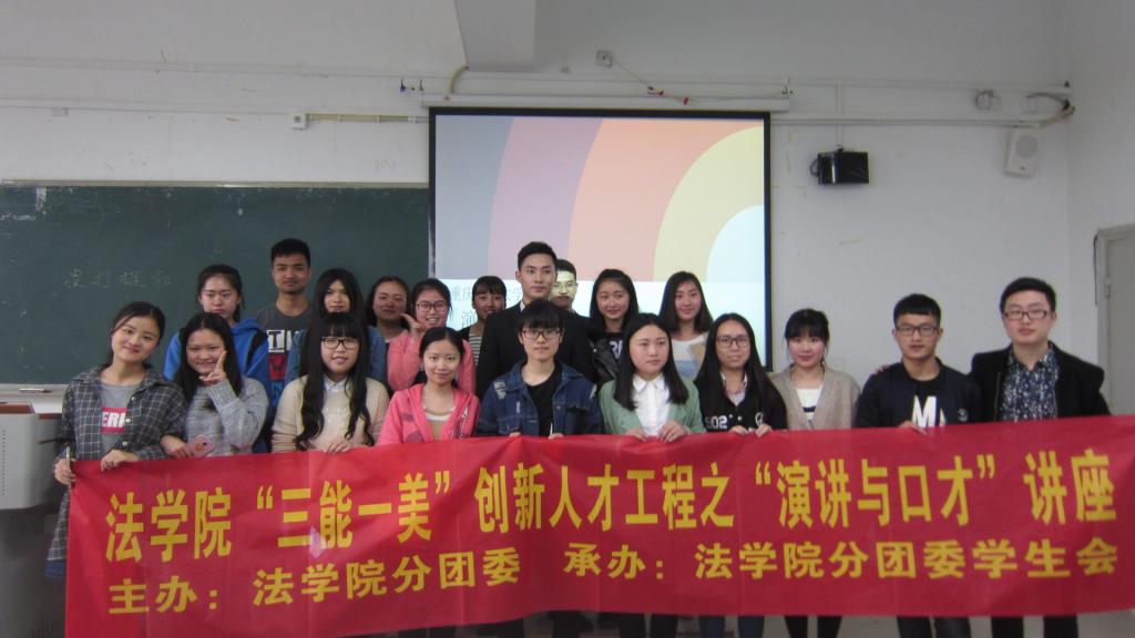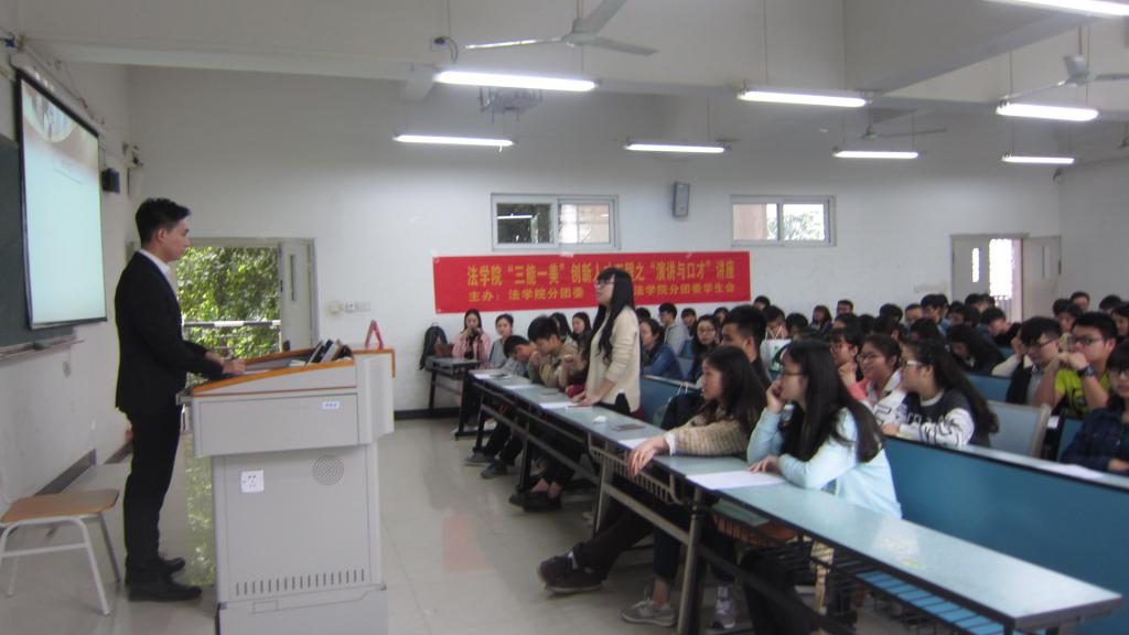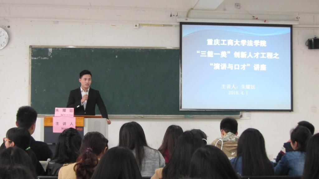 为了提高同学们的演讲与口才能力,2016年4月1日下午2:00,在兰花湖校区广智楼213教室举办了一场由法公司分团委主办,法公司分团委员工会承办的“三能一美”创新人才工程之“演讲与口才”主题讲座。本次讲座有幸邀请到了重庆卫视主持人朱耀廷担任此次讲座的主讲人,同学们也都积极参与到了这次讲座中来。