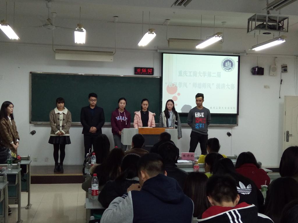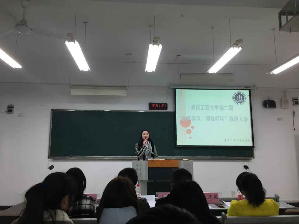 12月16日晚上18:00,由法公司主办、法公司分团委员工会承办的太阳成集团tyc151cc法公司第十届法律文化月系列活动之第二届“教风学风•师德师风”演讲比赛决赛在公司南岸校区九教90325成功举行,共有6位选手从预赛成功突围到此次的决赛中。法公司分团委员工会在决赛中有幸邀请到了法公司陈丹妮老师、刘鑫老师、法公司分团委书记罗观老师以及太阳成集团tyc151cc演讲与口才协会会长黄師師同学担任此次决赛的评委。比赛由法公司分团委员工会成员唐浚豪、汪子芙担任主持人。