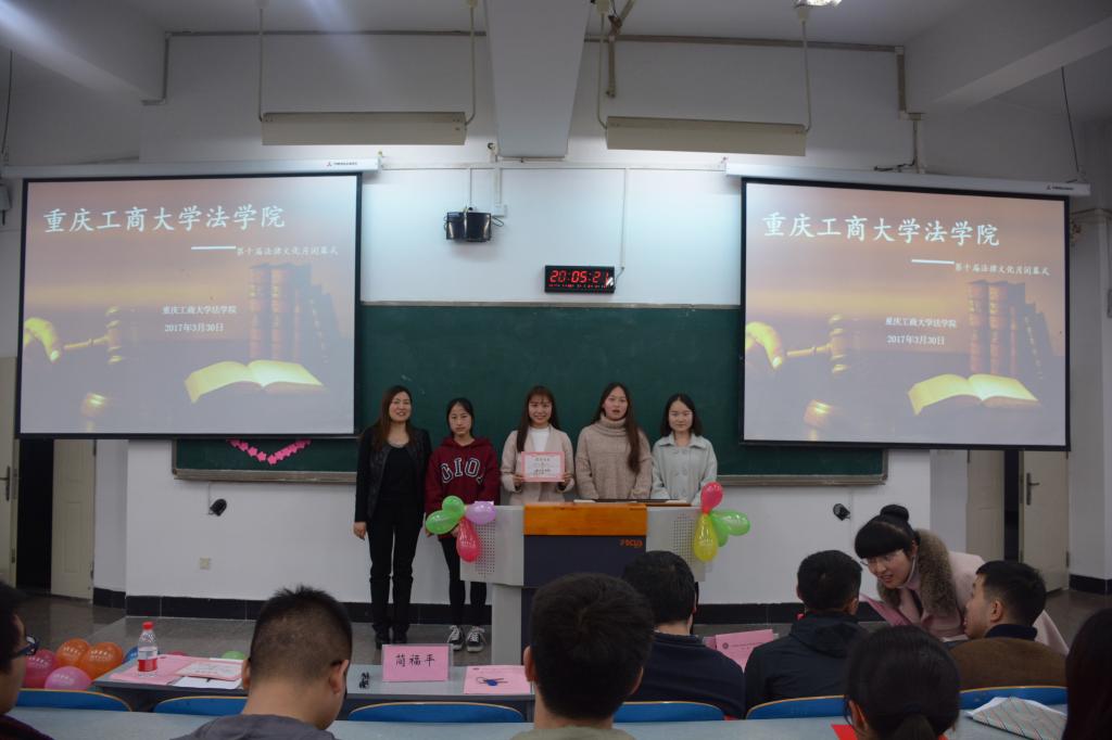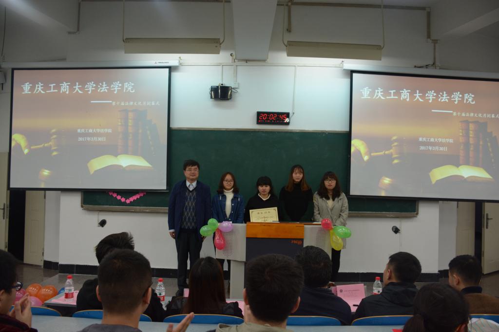 2017年3月30日晚18:00法公司第十届法律文化月颁奖典礼暨闭幕式在南岸校区慧智楼90326教室隆重举行。法公司陈丹妮老师主持了本次颁奖典礼暨闭幕式,法公司党总支书记李自维教授、法公司经理杨和义教授、法公司党总支副书记简福平博士、法公司副经理刘勇教授、公司党委宣传部程亚老师以及法公司部分师生代表共计150余人参加了本次活动。