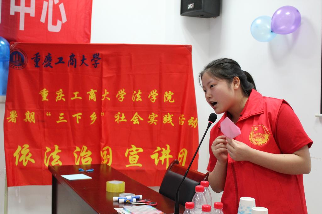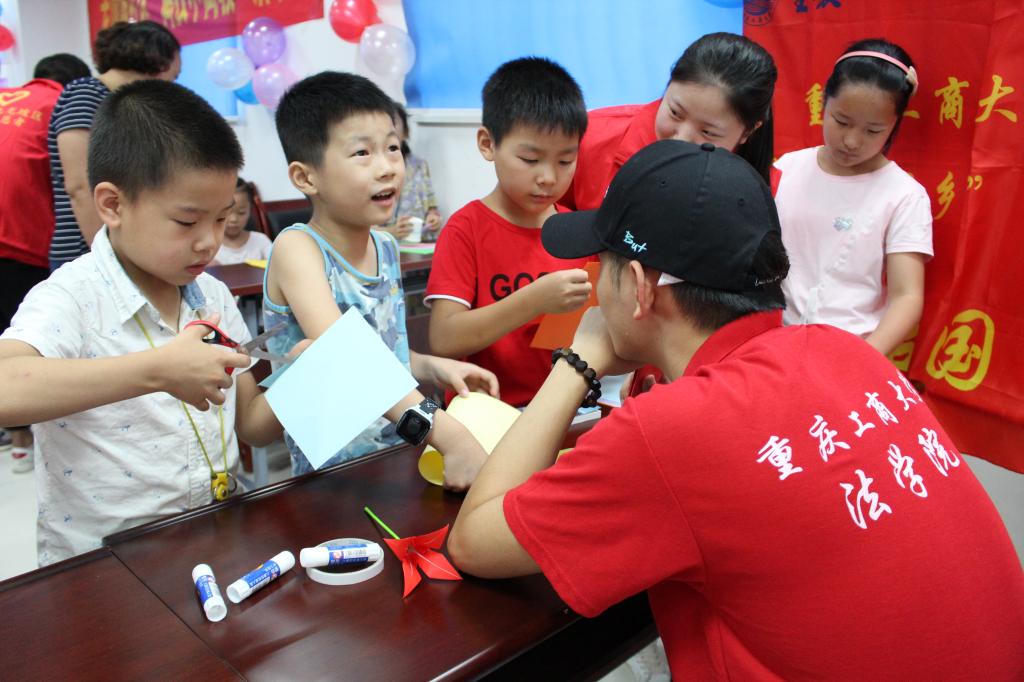 7月24日上午,太阳成集团tyc151cc法公司2018年暑期“三下乡”社会实践依法治国宣讲团在九龙坡区石桥铺街道老顶坡社区开展了暑期嘉年华之“跟我学手工”活动。通过引入《环境法》向社区小朋友们讲述保护环境的重要性,通过现场提问、传授保护环境知识等方式,使小朋友们投入废品利用手工活动中,树立环境保护意识。