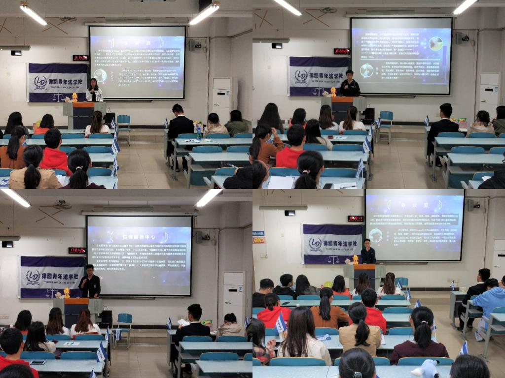 “三秋桂子,十里荷花。现在正处于树树秋色,天气渐凉的好时节,所以在这个好时节中,我们在此相遇。‘养浩然之正气,铸法治之精魂。’法学社在这里正式问候大家!”在主持人问候中,大会拉开了帷幕。首先,主持人介绍了此次大会流程,强调会场纪律;接下来,主持人简要介绍了出席本次大会的副社长和各部门部长,并根据PPT对社团性质、宗旨、部门架构以及招新情况进行了阐释和汇报,并结合近期工作计划,介绍了本学期即将开展的两场特色活动并对会员们提出积极参加活动的要求和希望;最后,五个部门的负责人也纷纷站上讲台,分别简述了各部门的职能和工作内容。在此期间,由学术部部长刘瑞迪带来的卡夫卡的《法的门前》与法律服务中心部长庞佳佳带来的有关“盗窃、抢夺、抢劫”的案例分析完美地诠释了法学社的特性与部门特色,成员们积极参与其中,沉浸在法学的无限魅力之中!