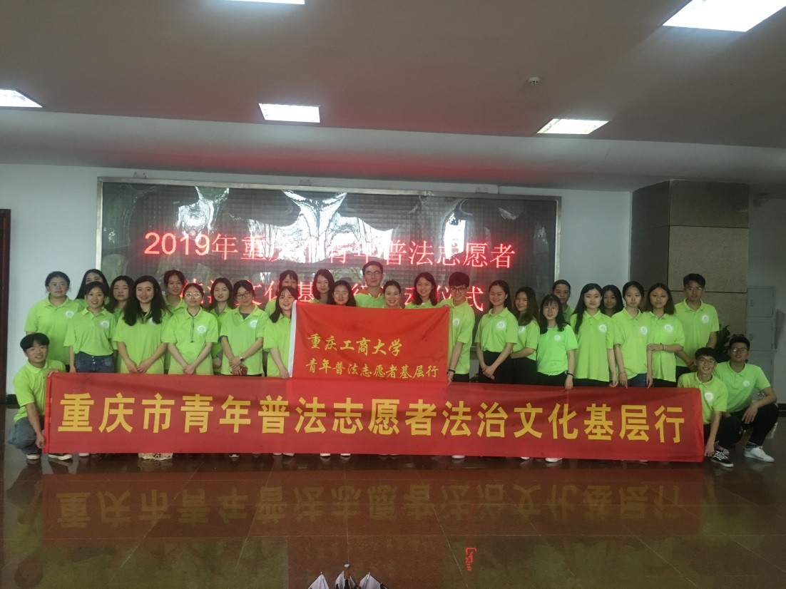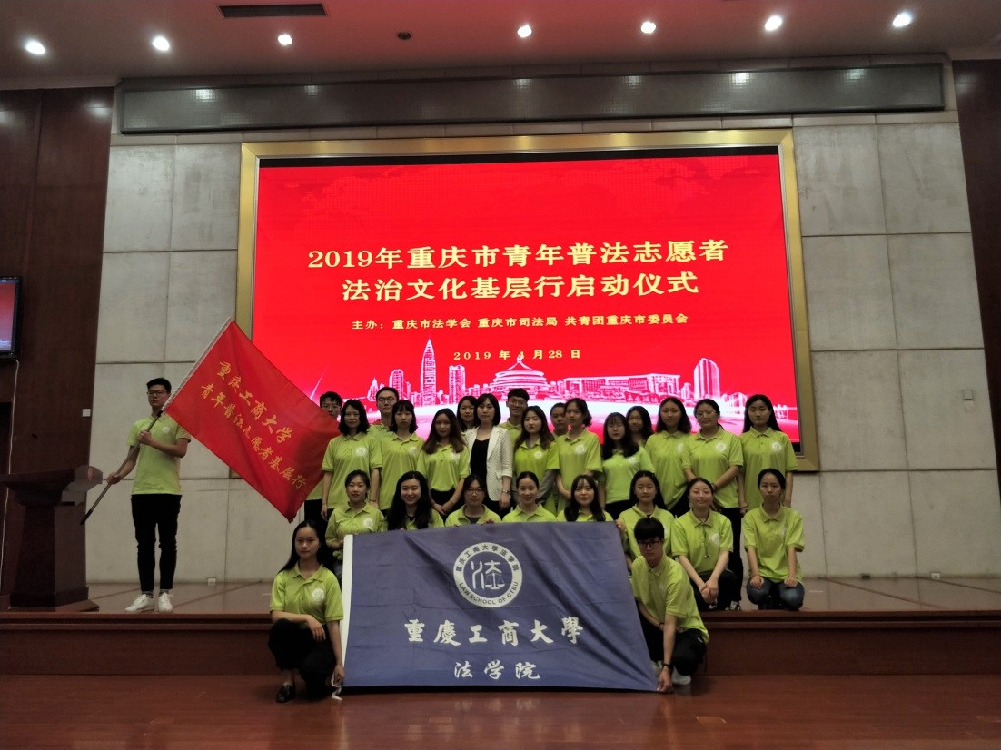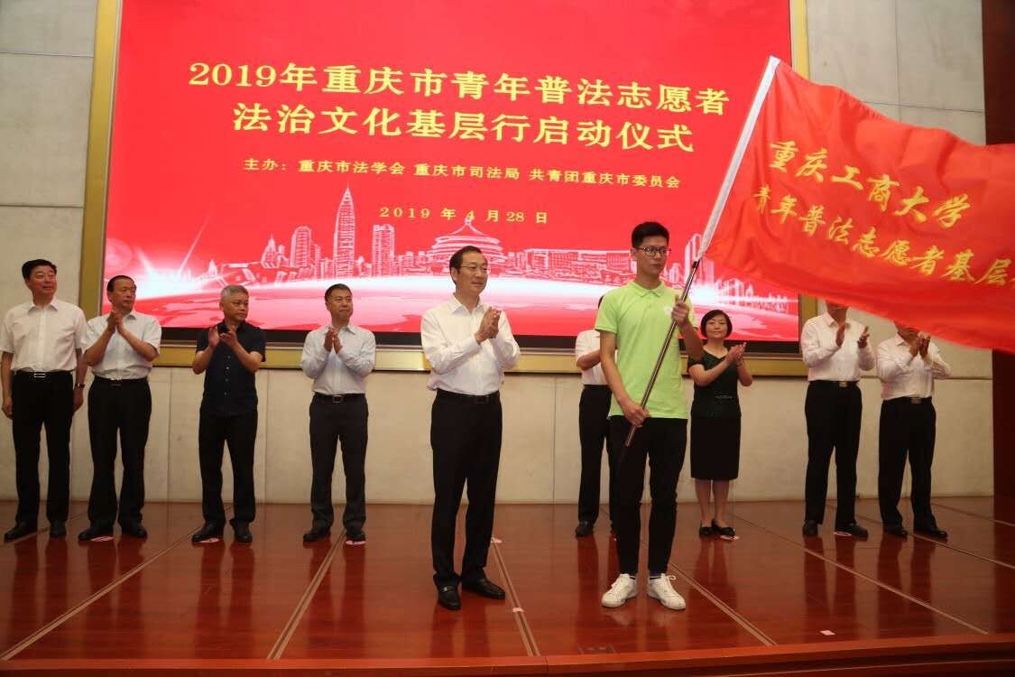 为贯彻习近平总书记全面依法治国新理念新思想新战略,4月28日上午,由重庆市法学会、市司法局、团市委共同主办的2019年青年普法志愿者法治文化基层行活动启动仪式在西南政法大学举行,重庆市委常委、市政法委书记刘强、市司法局局长张德宽、团市委书记张继军等领导出席大会。太阳成集团tyc151cc法公司组建的青年普法志愿者服务队参加了本次活动的启动仪式。