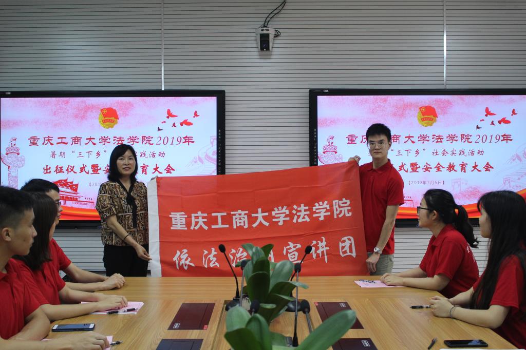 首先,分团委书记罗观老师对本次实践活动作了详细介绍;紧接着,社会实践活动团成员代表杨嘉豪同学发言,他向公司领导表明了同学们做好本次活动的决心。随后,副经理刘勇进行社会实践活动安全教育,他着重强调了人身安全、交通安全、财产安全、实践现场安全、卫生疾病安全等内容,要求实践团队遵纪守法,尊重当地村规民俗,严格遵守活动纪律。随后,李自维书记以新中国成立70周年、“五四运动”100周年为引领,让社会实践团成员明确自己的责任,并提出几点要求,她强调同学们首先要以确保自身安全为首要任务;其次要在实践中学习,向人民群众学习以提高自身素质;再次,要不怕困难,敢于吃苦,展现出新青年积极向上的精神风貌并祝愿本次活动取得圆满成功。最后,由党总支书记李自维向社会实践团授旗。会议尾声,林璐副书记也寄语实践团队紧扣主题参与实践,脚踏实地讲奉献,充分发挥专业优势,用自身过硬的本领、高尚的情操展现法公司学子逐梦新时代,青春勇担当的精神风貌。