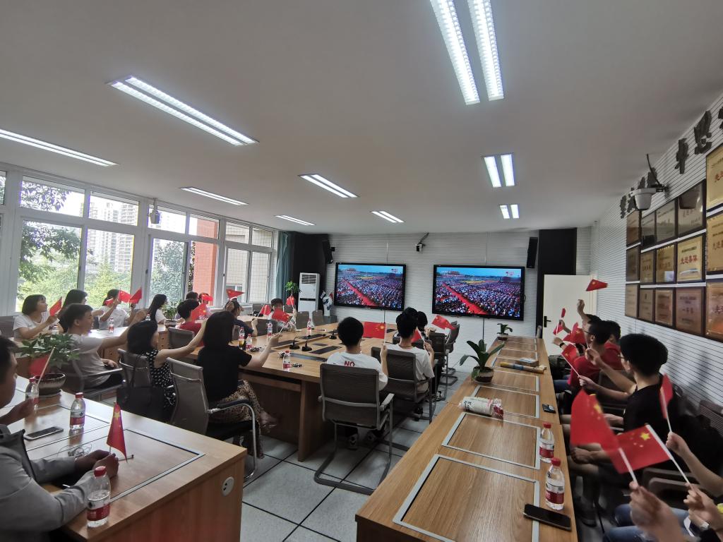 庆祝大会开始,师生们跟随着仪式庄严地唱起国歌,抒发内心对祖国无限的热爱,还情不自禁地挥动手中的国旗,表达对祖国70周年辉煌成就的赞美之情。当大家看到“三军仪仗”、“坦克装甲”、“导弹装备”等一个个雄姿英发、装备优良的部队方阵,惊叹祖国强大的军事力量,为伟大祖国感到自豪。“今天,社会主义中国巍然屹立在世界东方,没有任何力量能够撼动我们伟大祖国的地位,没有任何力量能够阻挡中国人民和中华民族的前进步伐。”习近平总书记在庆祝中华人民共和国成立70周年大会上的讲话铿锵有力,振奋人心,公司师生们认真聆听了总书记讲话中的每一字每一句,每个人内心都激动不已。李国豹老师激动地说道:“这样的庄严宣告令我热血沸腾!作为一名入党积极分子,重任在肩,立志全力拼搏。”曹珈铭同学表示看到祖国强大的武装力量,民族自信心和自豪感油然而生,感激无数烈士先辈的无私奉献,换来今天我们的幸福生活。作为新时代青年应该树立远大理想,为社会主义建设添砖加瓦。周思言同学分享了看到依法治国方队的激动心情,讲述了未来学习规划,立志在专业上学有所成,为祖国的法治进程贡献力量。