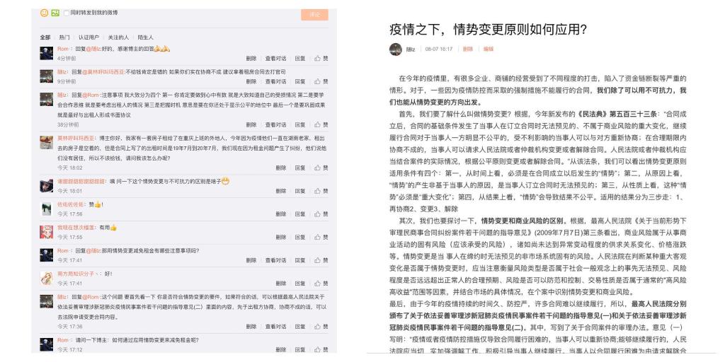 同时,老员工志愿者们利用微博等新媒体平台与关心《民法典》的网友进行互动交流,发布了《疫情之下,情势变更原则如何应用?》等系列文章,详细地解答了情势变更原则适用条件、买卖合同的解除等,尤其是受疫情影响房屋租赁合同的调解办法等社会热点问题更是备受网友关注。