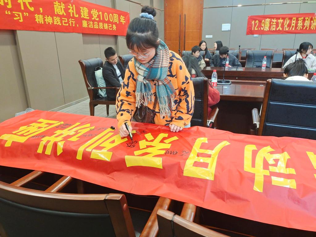 第一个环节是签名活动,支部团员在“12.9廉洁文化活动月系列讲座”的横幅上进行主题签名,通过签名活动增强老员工对于廉洁建设的强烈的参与感和责任感,让大家充分树立“廉洁建设,从我做起”的信心。