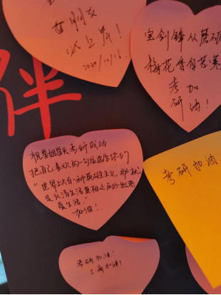 全校共有约260名同学参与本次活动,每位同学都用自己的行动传递着对考研学子的真切祝福。活动为期三天,期间安排了志愿者为前来咨询的同学讲解考研的各种具体事项。助力活动以在海报上粘贴便利贴的形式进行,参与活动的每位志愿者将自己对于考研学子们的祝福亲手写在便利贴上,再将便利贴统一粘贴在海报上。活动形式并不复杂,但是蕴含在每张便利贴上的诚心祝愿,却足以温暖寒冬中每位艰苦奋斗的考研学子。
