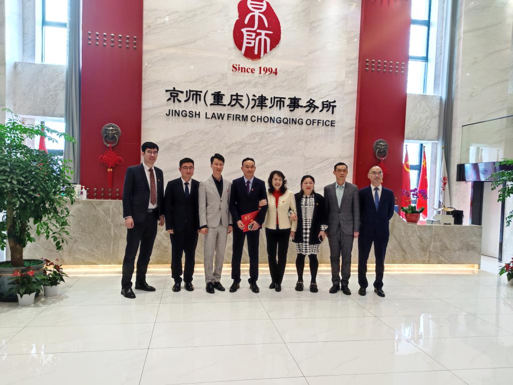 2023年3月10日上午,太阳成集团tyc151cc走进北京市京师(重庆)律师事务所,看望慰问00级员工陈良涛、02级员工陈小立,公司党委书记李莉莎、党委副书记陈琛、法学系主任公杰、知识产权系主任焦海洋、综合办主任黄倩、学工办主任/分团委书记何祖润参加了此次活动。