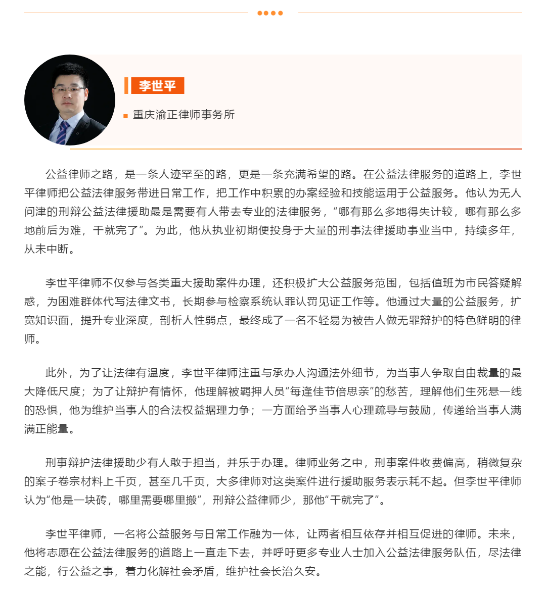 一、公司2010级法学专业员工李世平入围2020年“年度最佳公益服务律师”