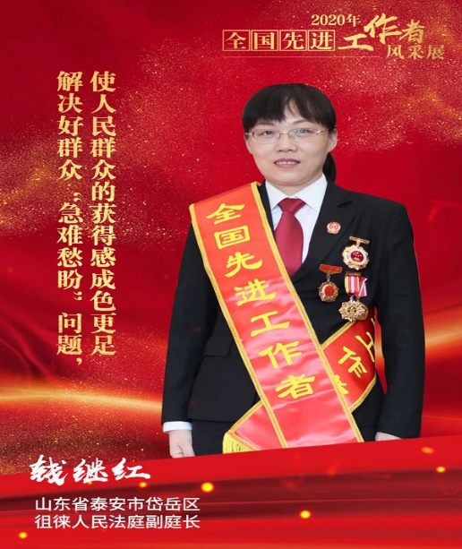 钱继红,女,汉族,山东泰安人,1981年1月出生,中共党员,2004年7月参加法院工作,现任山东省泰安市岱岳区人民法院徂徕人民法庭副庭长、二级法官。曾荣获全国模范法官、山东省优秀共产党员、山东省“人民满意的公务员”、全国巾帼建功标兵等荣誉。荣誉的背后,钱继红付出了巨大的艰辛和努力。钱继红自2004年参加工作以来,一直扎根在最偏远的农村山区法庭,一干就是十六年。十六年来,她上午开庭审案,下午去偏远的农村山区送达,到田间地头调解。十余年如一日,扎根山区,无怨无悔,成为这里最受群众尊敬与热爱的好法官,被老百姓称为“乡村法官”,她没有惊天动地的事迹,但是平凡中的点滴,却折射出了耀眼的光辉。钱继红出生在农村,一直怀着对人民群众的深厚感情干工作。工作中,钱继红在每一个细节上都替当事人着想,用真心换来当事人的安心、顺心。特别是她针对农村情况,总结了“抓住三个环节,用活三种方法”工作思路。抓住三个环节就是:庭前了解掌握全貌、庭中化解打开心结、庭后调解解开疙瘩。用活三种方法就是:拉家常将理说明白、开好庭把法讲清楚、抓调解以情打动人。钱继红正是凭借这套工作方法,把刚性的法律与柔性的司法有机结合。她所办理的案件无一申诉信访,无一投诉举报,无一错案。工作16年来,钱继红廉洁奉公,从未发生过违法违纪现象。